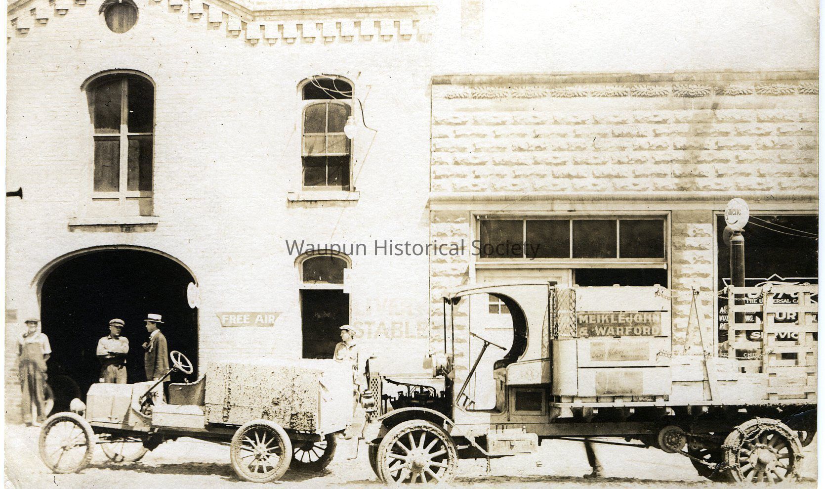 Modes of Transportation. This postcard is part of the museum collection on transportation. Please note, that the sign on the truck says, "Meiklejohn & Warford.' It is also taken in front of the Ford Dealership advertised on 2001.0042.0001 before the company became Meiklejohn & Son.Acquisition