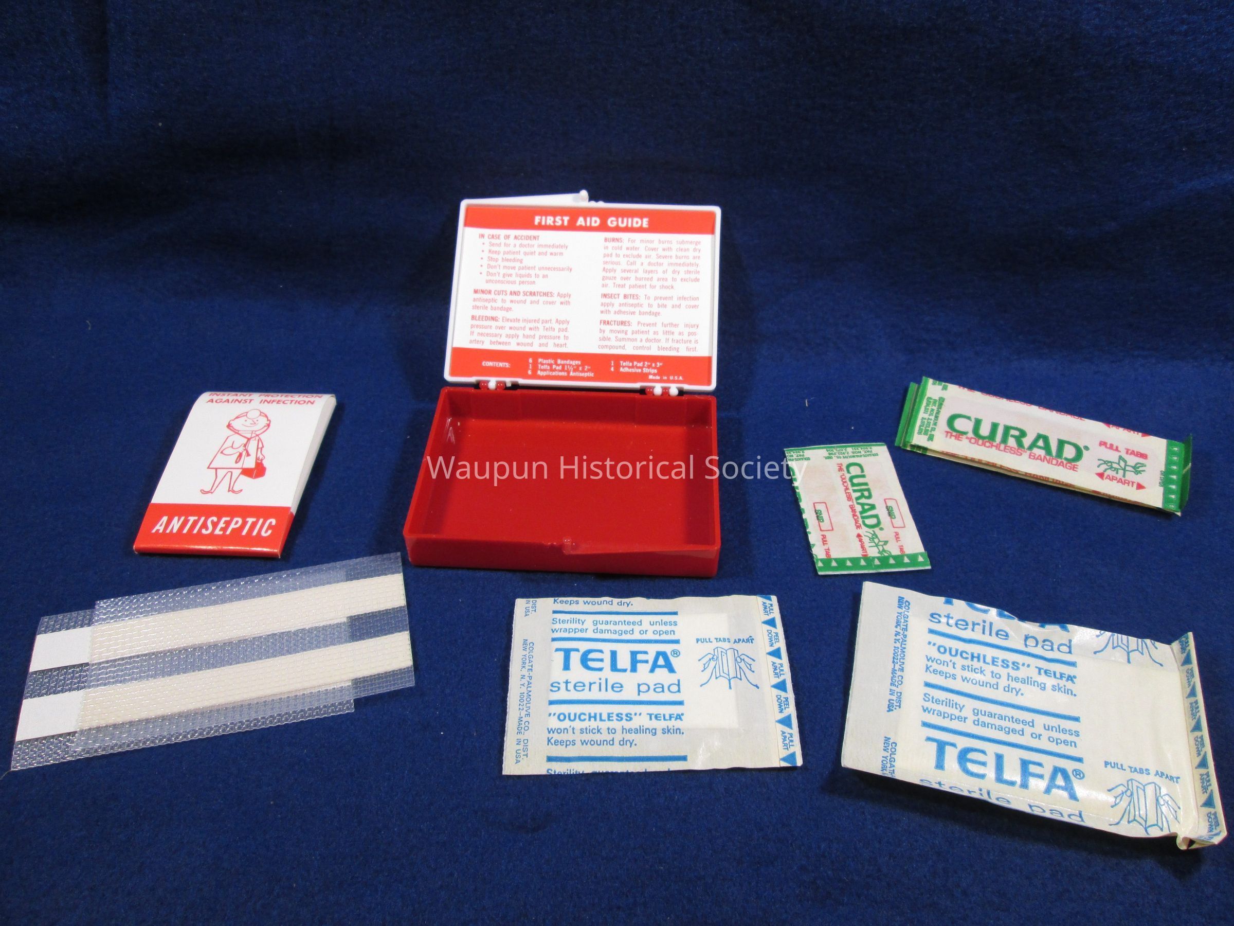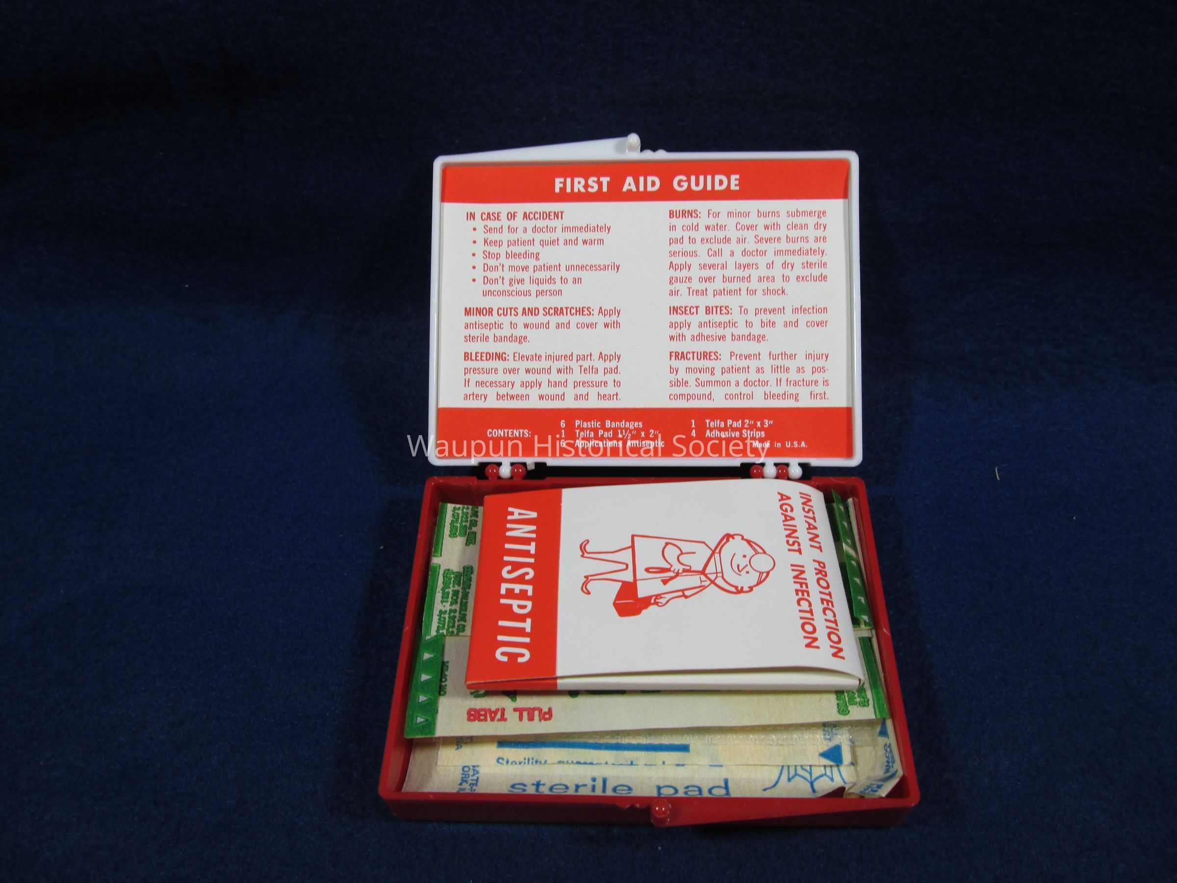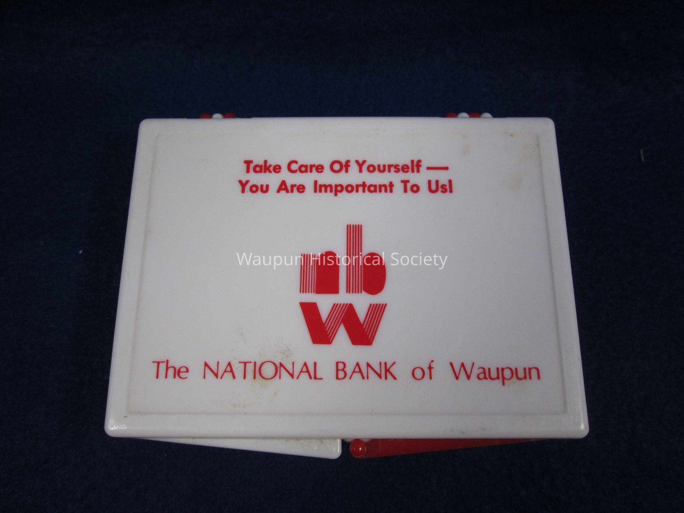 First Aid kit advertising The NATIONAL BANK of Waupun; has Take Care of Yourself - You Are Important To Us! printed in red on a white background on the top cover of the small container. Inside the box is an antiseptic package which contains little "pillows" with a liquid antiseptic, several sizes of bandages and adhesive strips. On the inside of the lid is a FIrst Aid Guide.Acquisition