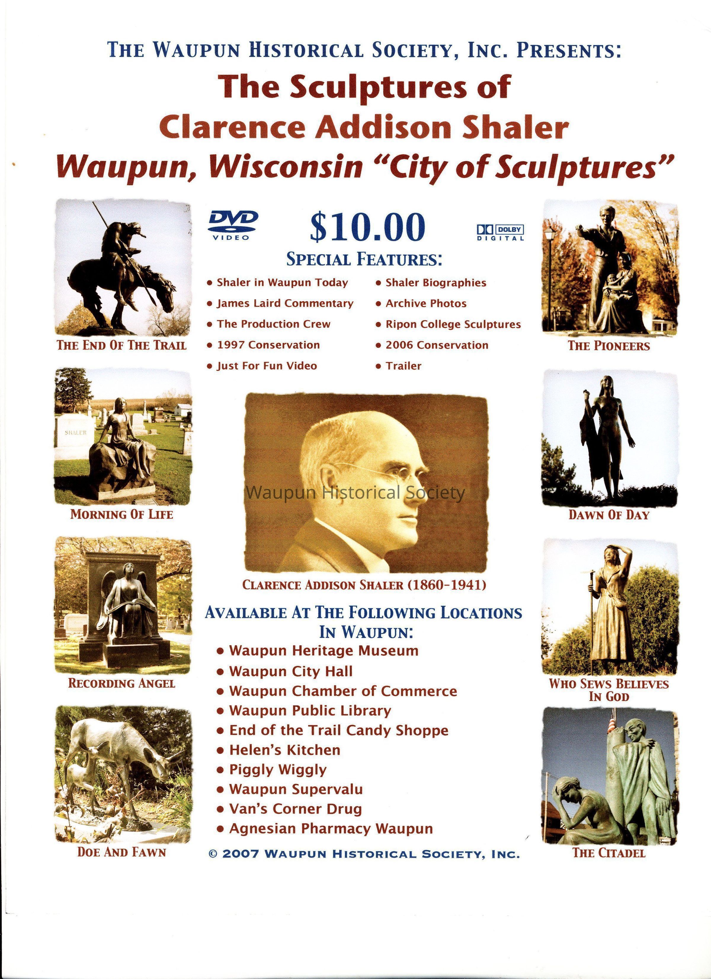 Sign advertising the DVD "The Sculptures of Clarence Addison Shaler, Waupun, Wisconsin "City of Sculptures." The Waupun Historical Society sold these DVDs during 2008 and 2009. These signs were placed around Waupun to encourage people to buy the DVD. The sign has pictures of: Clarence Addison Shaler, The End of the Trail, Morning of Life, Recording Angel, Doe and Fawn, The Pioneers, Dawn of Day, Who Sows Believes in God, and the Citadel. Mr. Richard Peters of Fox Lake, Wisconsin did the computer electronic work to create the DVD and he also created this poster. The DVD was available at: Waupun Heritage Museum, Waupun City Hall, Waupun Chamber of Commerce, Waupun Public Library, End of the Trail Candy Shoppe, Helen's Kitchen, Piggly Wiggly, Waupun Supervalu, Van's Corner Drug, and Agnesian Pharmacy Waupun.Acquisition