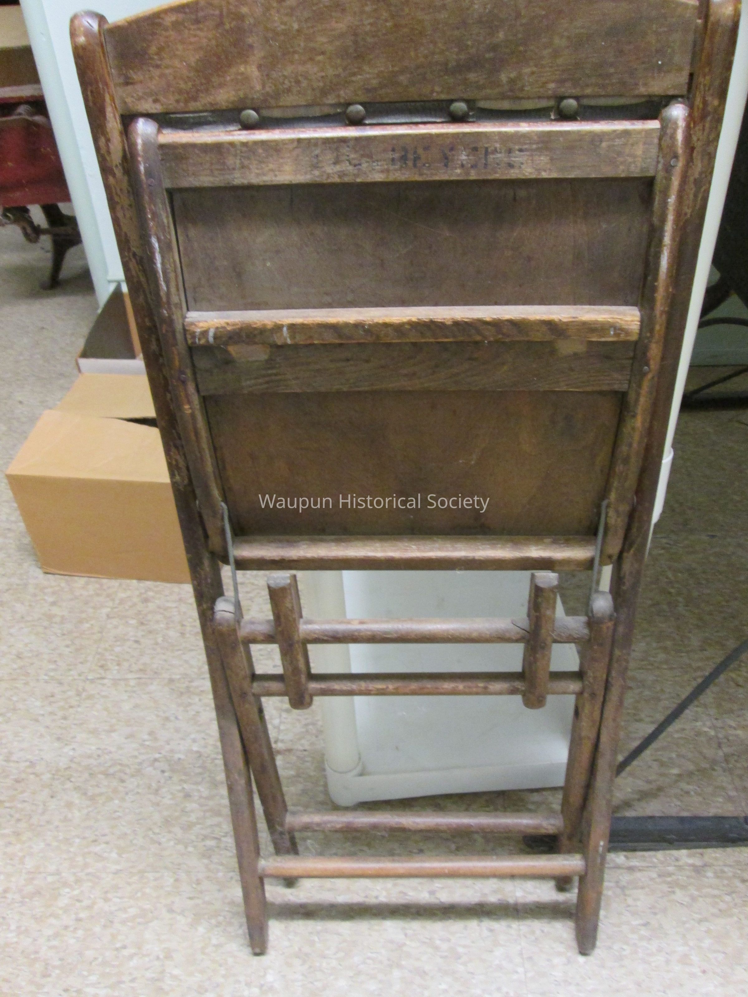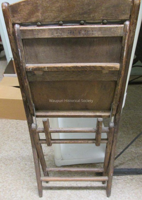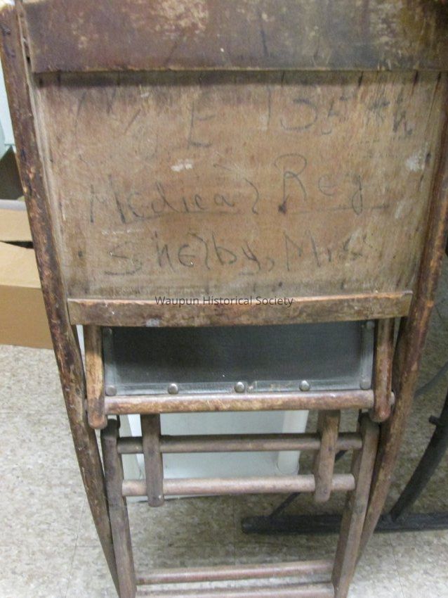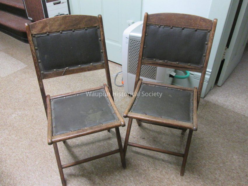 (2) Wooden Folding Chairs. These two chairs are representative of a group of chairs given to the Waupun National Guard by the H. L. Beyers Funeral Home. The chairs were used as camp chairs in the 1930's when the Waupun National Guard-Company E of the 135th medical regiment would go for their annual summer encampment at Camp Shelby, Mississippi. The Company E pictures are on the north wall and Master Sergeant Bert Redman of Waupun, who preserved these chairs through the years is pictured there. *Donated by his son, David Redman.*Acquisition