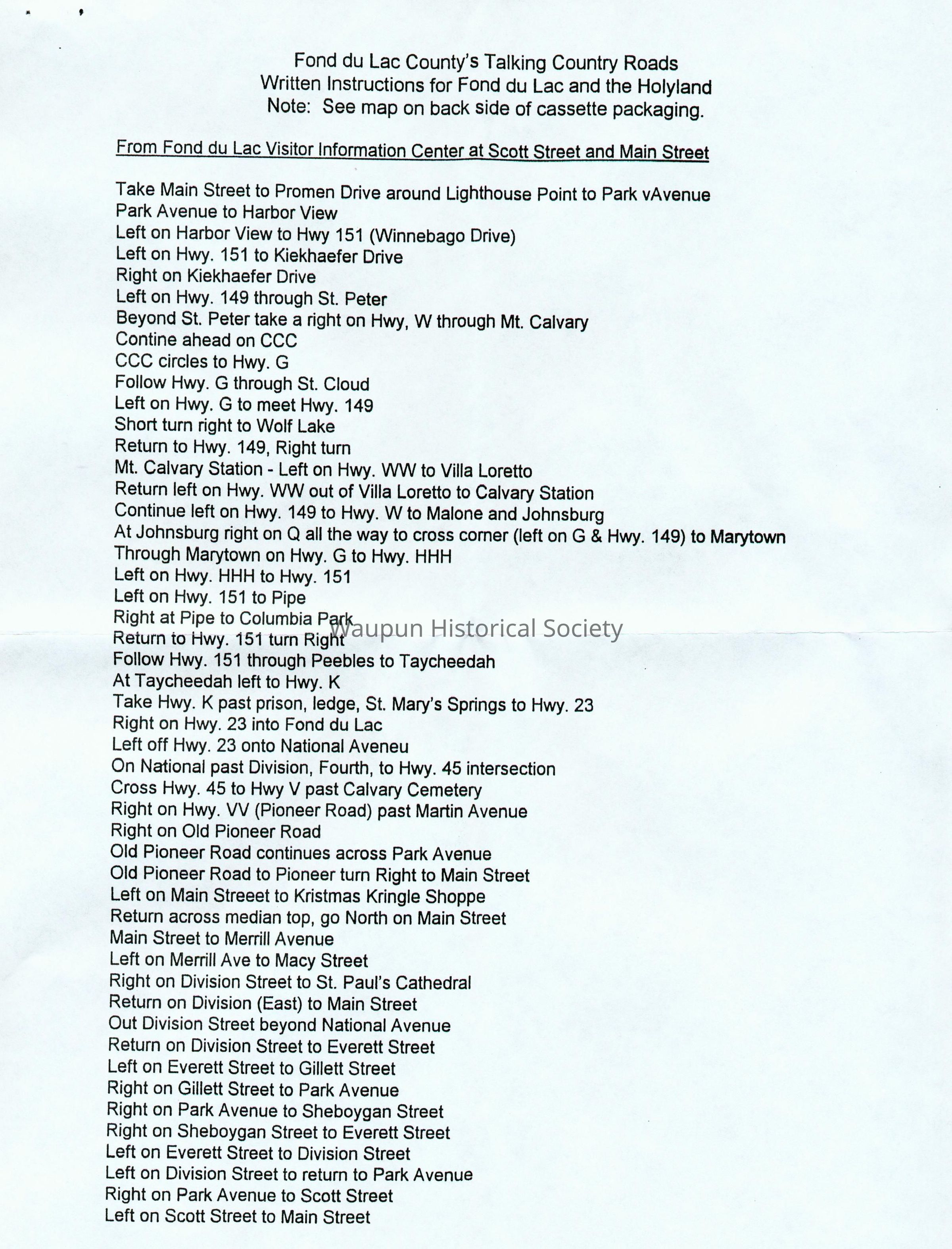 This is an 8 1/2" X 11" inch page of directions labeled "Written Instructions for Fond du Lac and the Holyland." It relates to tape 2002.0003.0004 in the object collection. Item 2002.0003.0005 is a brochure that relates details for all four trips.Acquisition