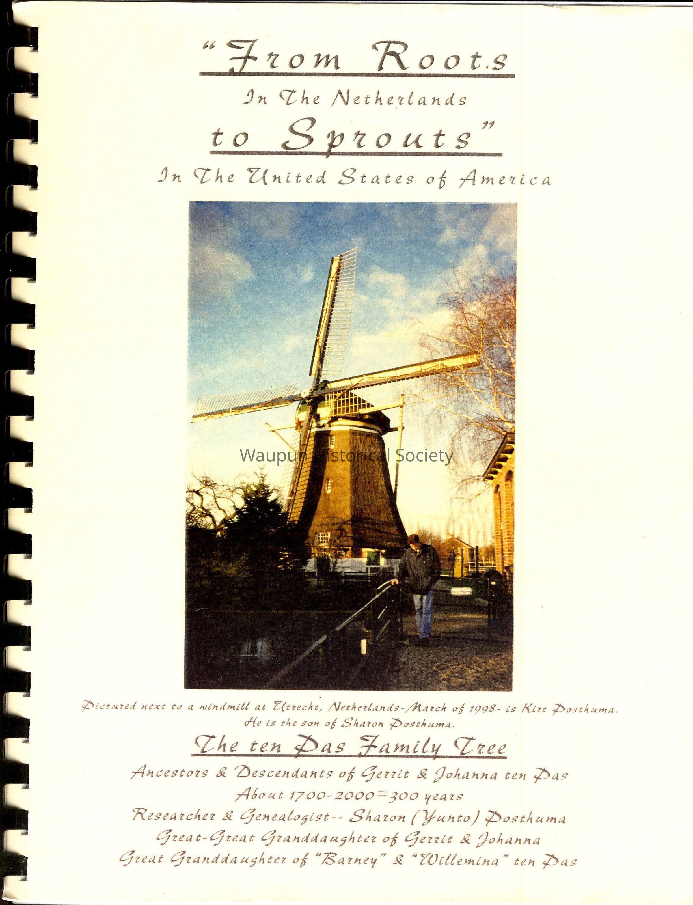 The tenPas Family Tree - A color photo is in the middle of soft cover - it is a windmill at Utreht, Netherlands - March of 1998 - Kirt Posthuma is pictured next to the windmill. He is the son of Sharon Posthuma (Yunto), Researcher and Geneologist, great-great granddaughter of Gerrit & Johanna tenPas, great granddaughter of "Barney" & "Willemina" tenPas.