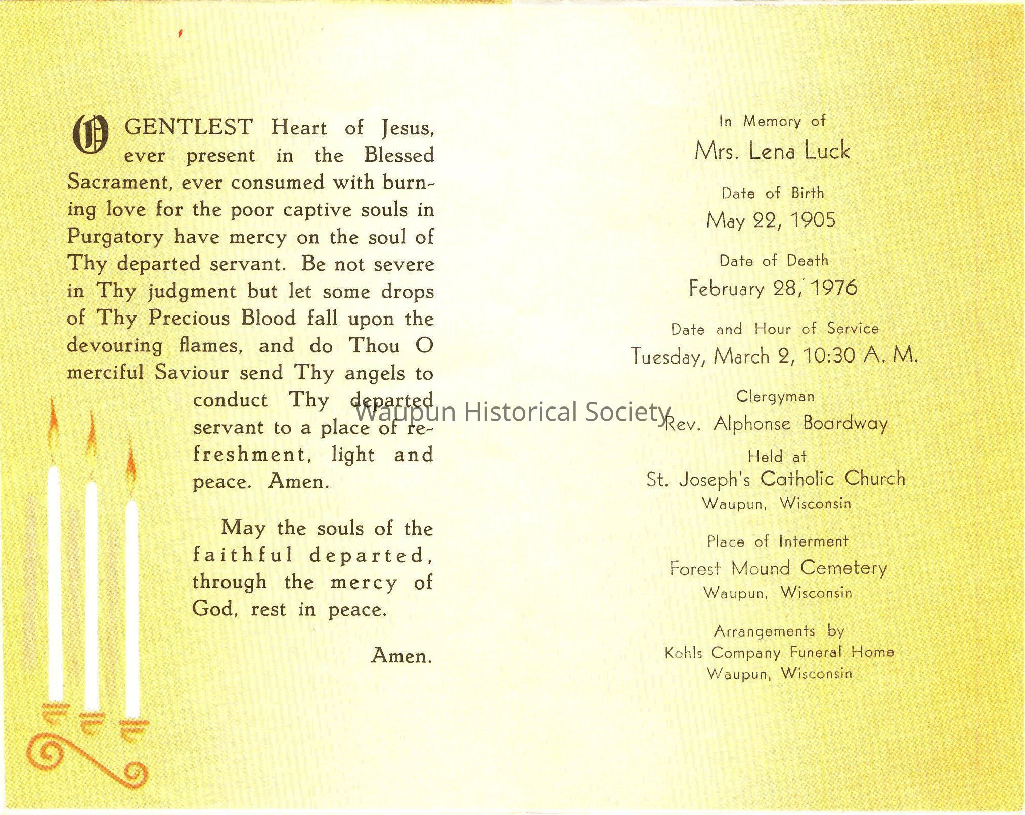 Funeral card In Memory of Mrs. Lena Luck, Date of Birth, May 22, 1905, Date of Death, February 28, 1076, Date and Hour of Service, Tuesday, March 2, 10:30 A. M. Clergyman, Rev. Alphonse Boardway, Held at St. Joseph's Catholic Church, Waupun, Wisconsin, Place of Interment, Forest Mound Cemetery, Waupun, Wisconsin, Arrangements by, Kohls Company Funeral Home, Waupun, Wisconsin.Acquisition
