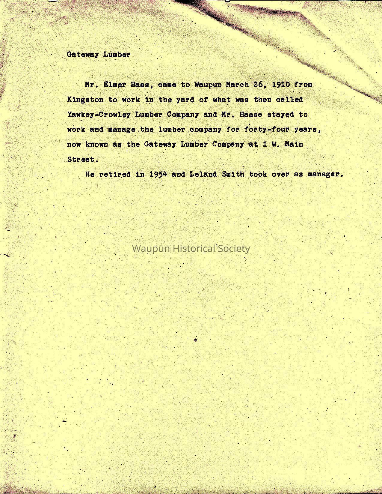 Mr. Elmer Haas, came to Waupun March 26, 1910 from Kingston to work in the yard of what was then called Yawkey-Crowley Lumber Company and Mr. Haase stayed to work and manage the lumber company for forty-four years, now known the Gateway Lumber Company at 1 W. Main Street.