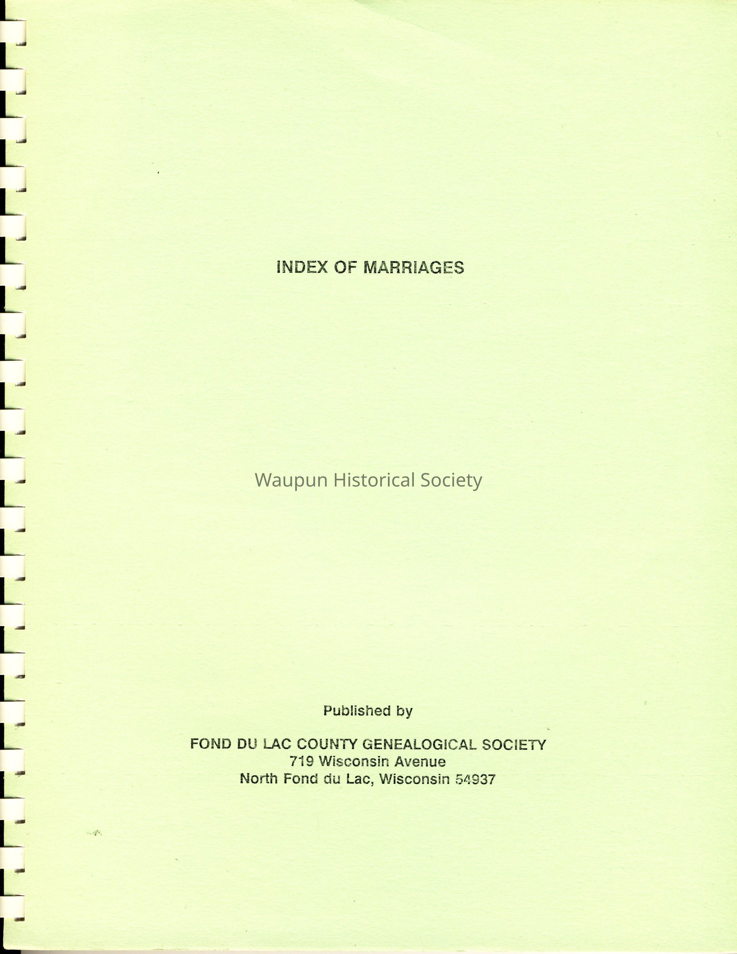 Index of Marriages in Fond du Lac County, Wisconsin. Published by the Fond du Lac County Genealogy Society. Covers the years 1844 to 1879. Book is published in April 1979.Acquisition