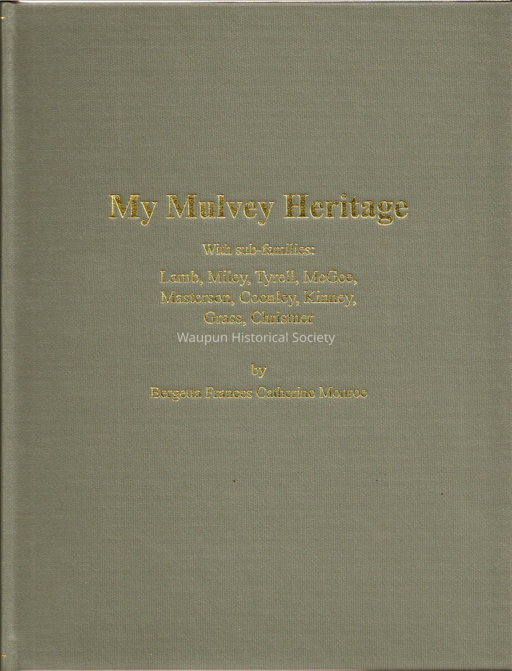 "My Mulvey Heritage" is a genealogy of several families. It was collected by Bergettta Frances Catherine Monroe. Has the Lamb, Milley, Tyrell,McGee, Masterson, Coonley, Kinney, Grass and Christner families.Acquisition