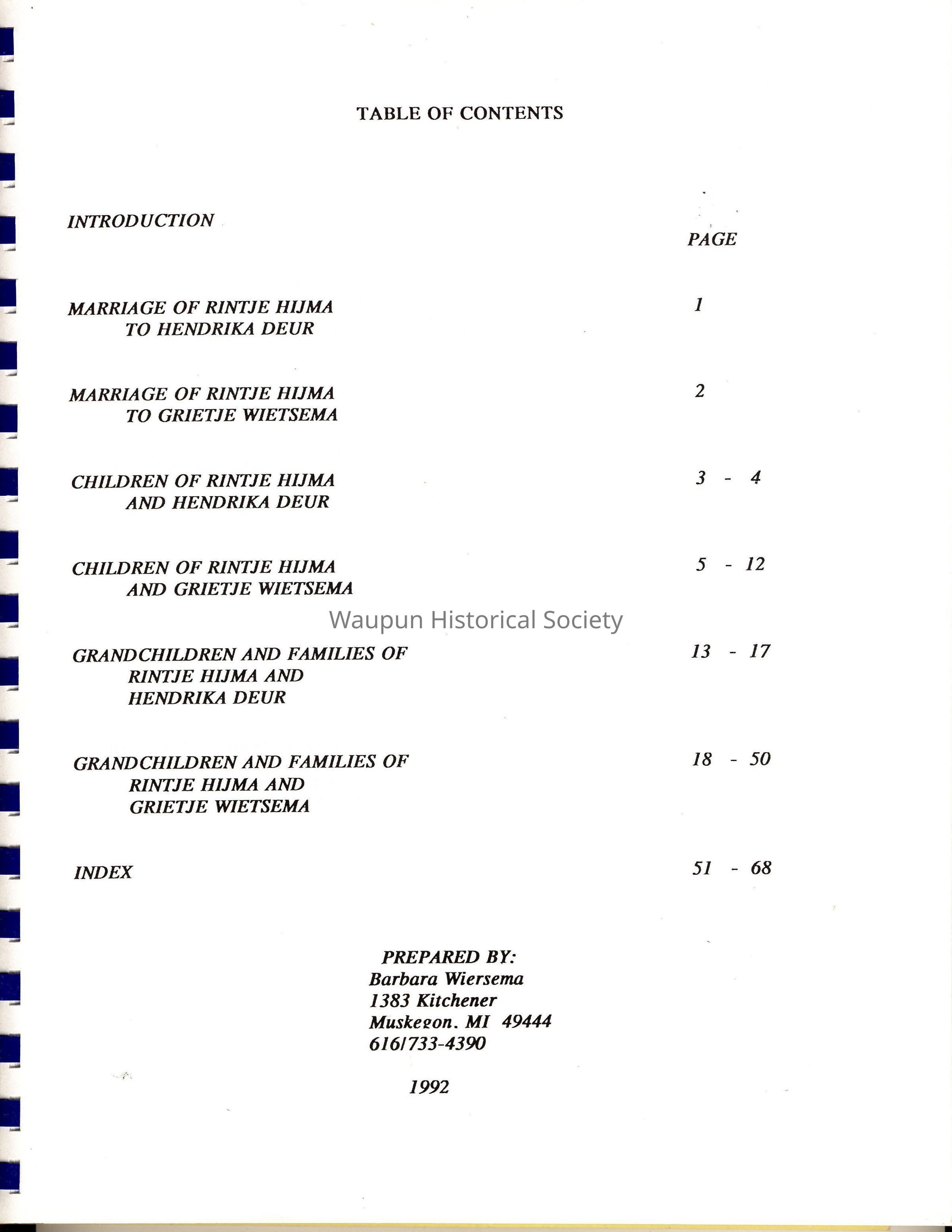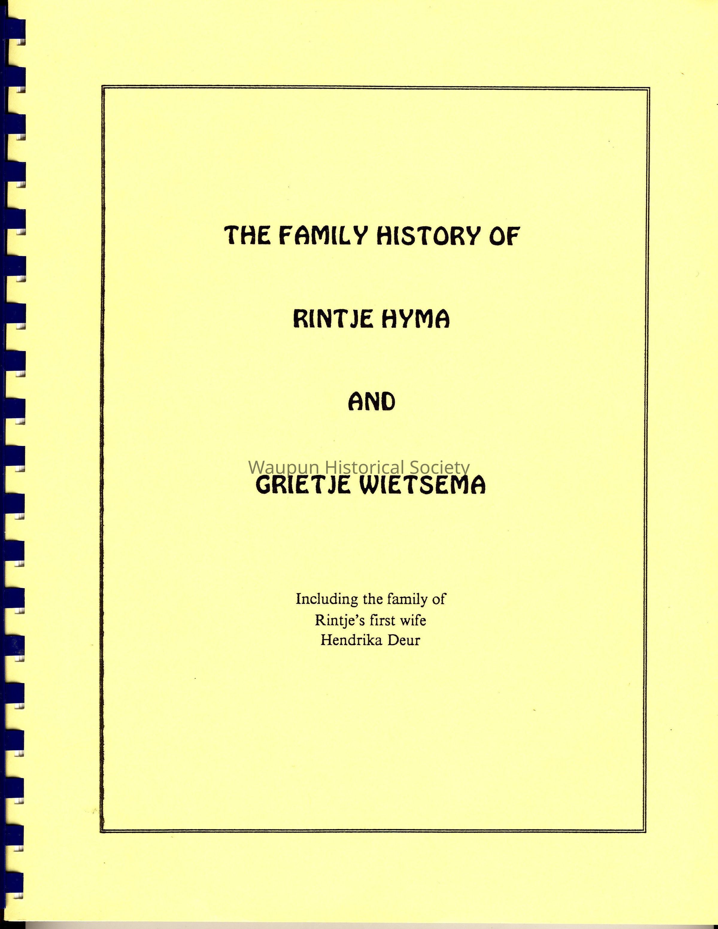 The Family History of Rintje Hyma and Grietje Wietsema. Also including the family of Rintje's first wife Hendrike Deur. Published by Barbara Wiersema, 1383 Kitchener, Muskegon, MI 49444, (616) 733-4390. The publication date is 1992.Acquisition