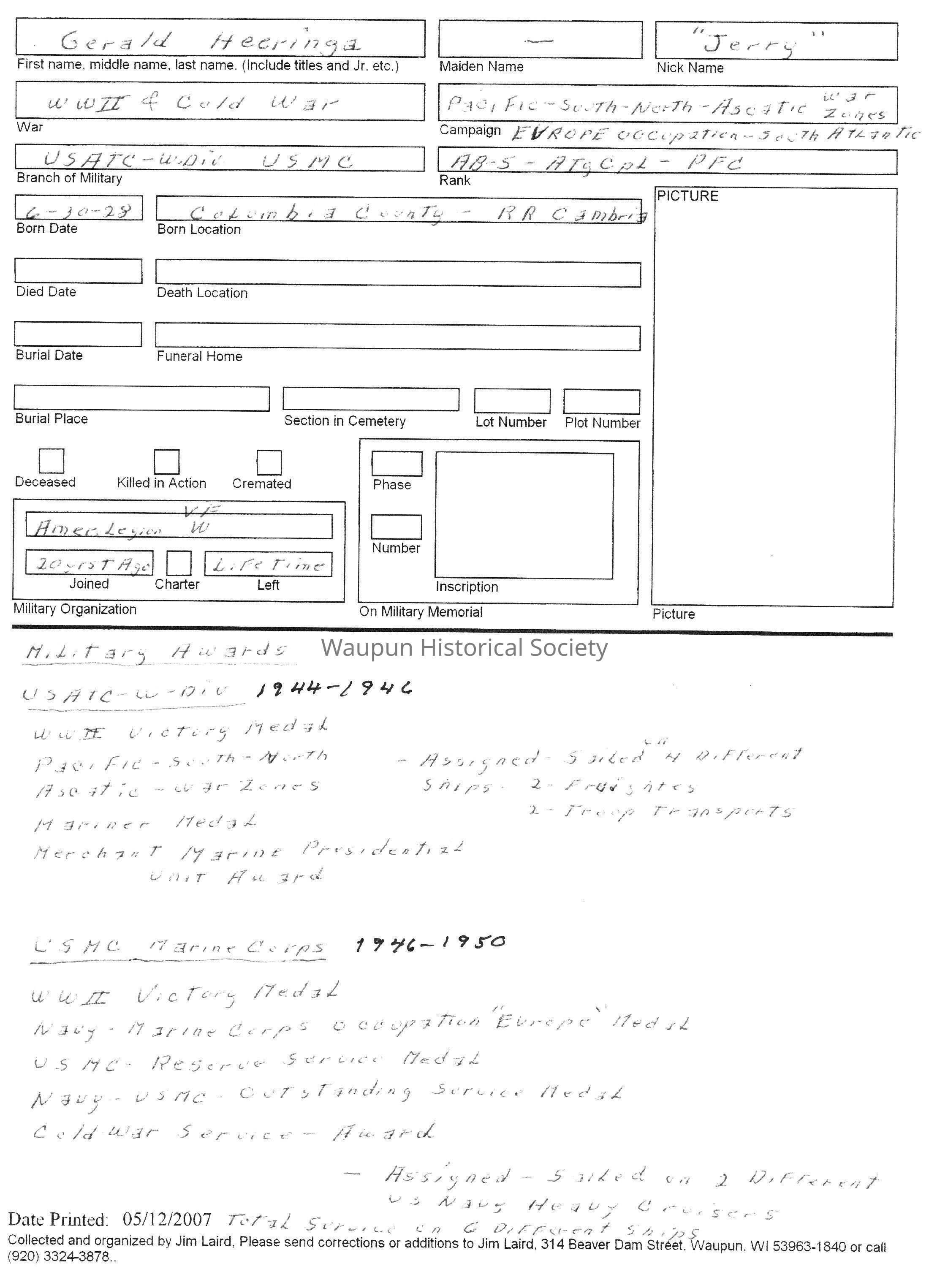 Military Information, Gerald "Jerry" Heeringa, WWII & Cold WarEntry/Object ID