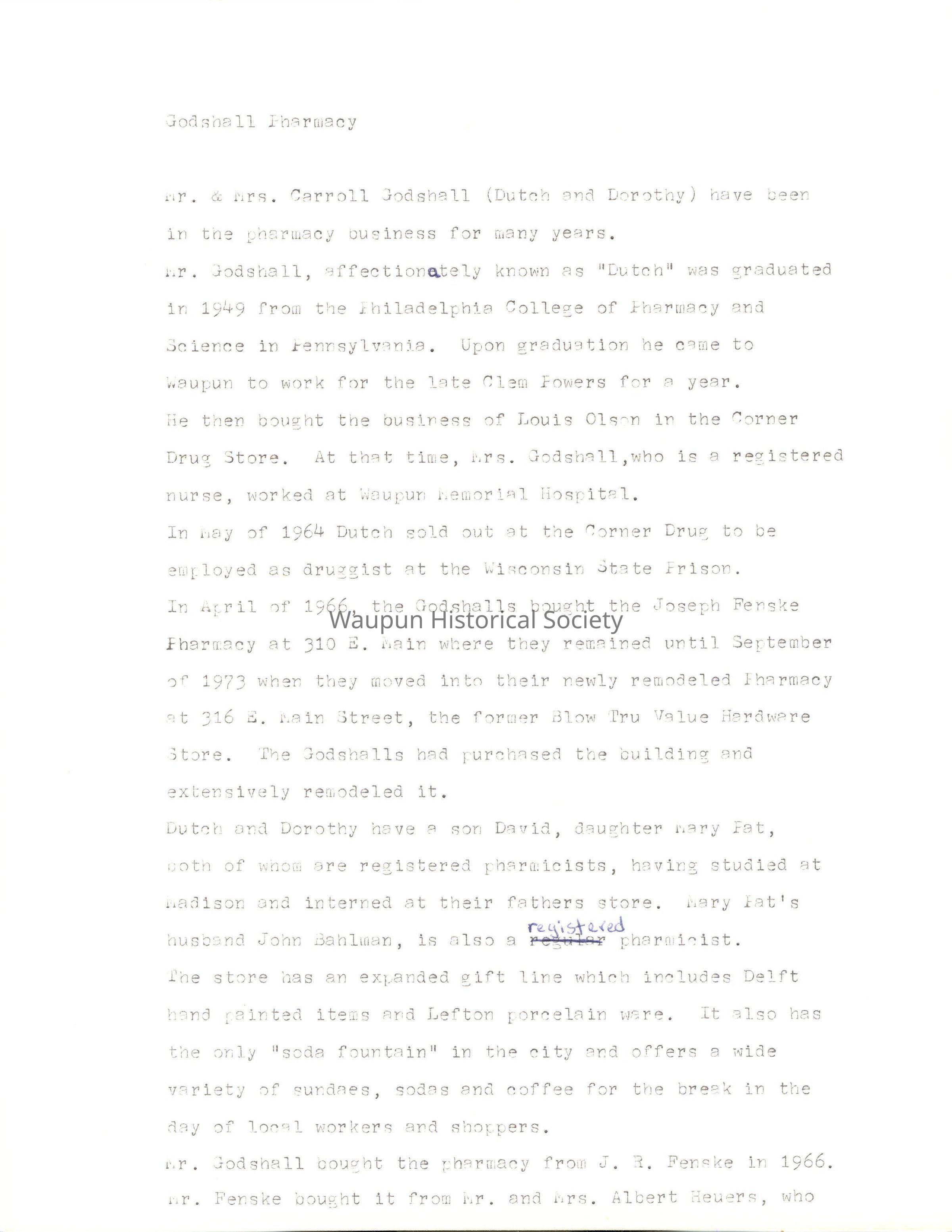 He then bought the business of Louis Olson in the Corner Drug Store. At that time, Mrs. Godshall, who is a registered nurse, worked at Waupun Memorial Hospital.