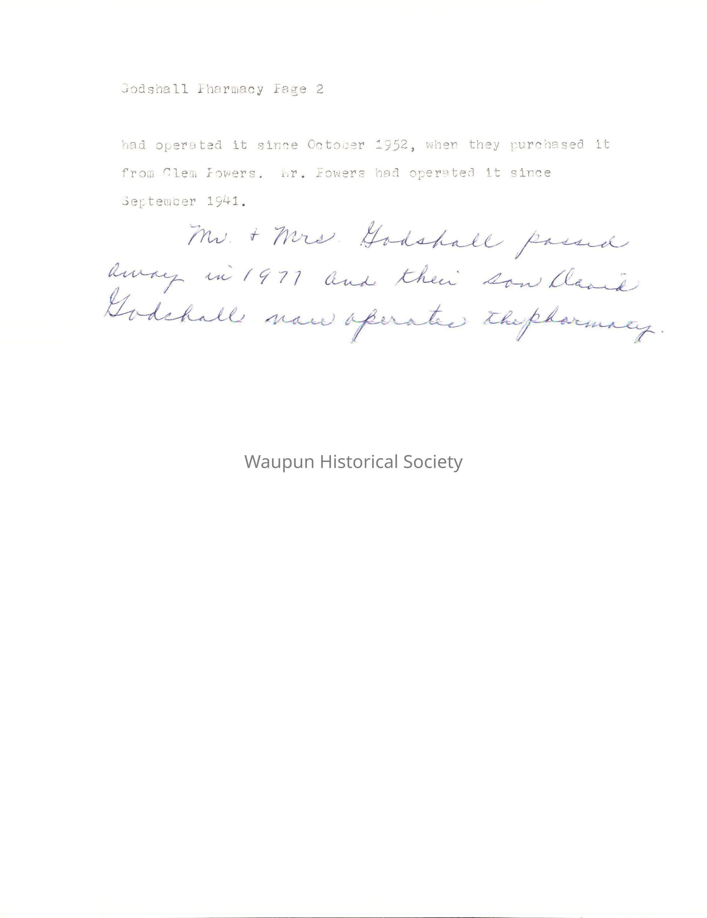 Godshall bought the pharmacy from J. R. Fenske in 1966. Mr. Fenske bought it from Mr. and Mrs. Albert Heuers, who had operated it since October 1952, when they purchased it from C1em Powers. Mr. Powers had operated it since September 1941.