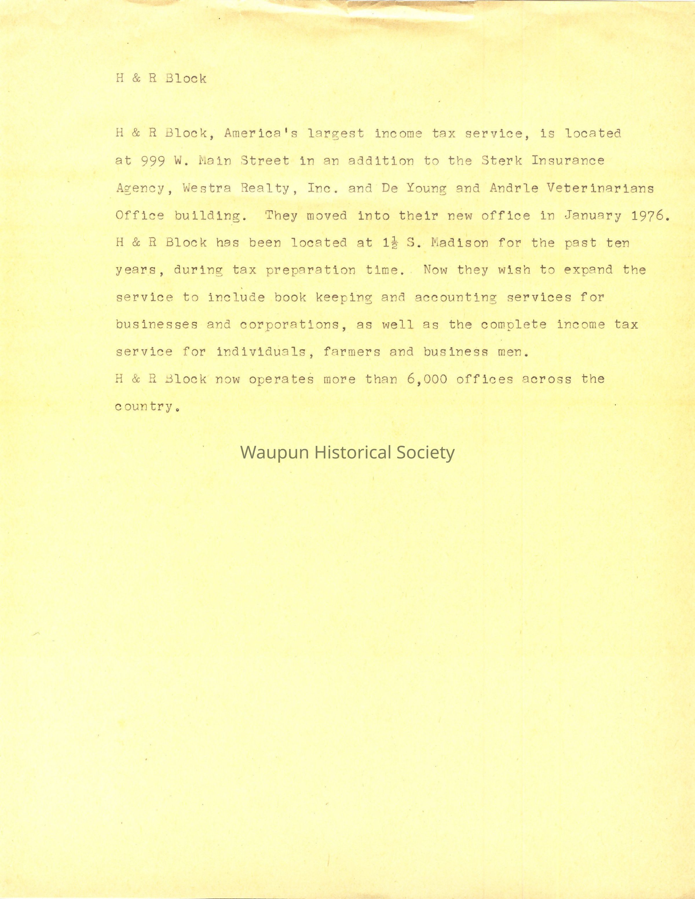 Historical information on H & R Block for 1976 Bicentennial Celebration in Waupun, WI
