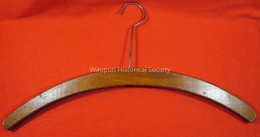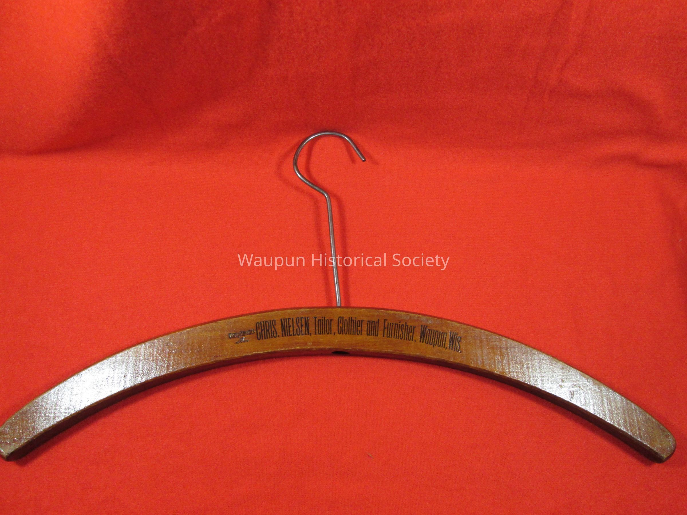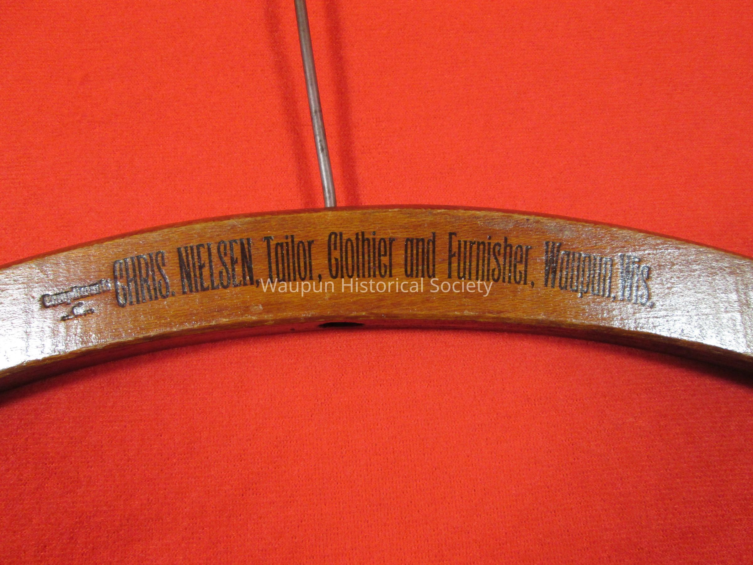 Wooden clothers hanger with long metal hook as hanger. Compliments of CHRIS. NIELSEN, Tailor, Clothier and Furnisher, Waupun, Wis. stamped on front of hanger.Acquisition