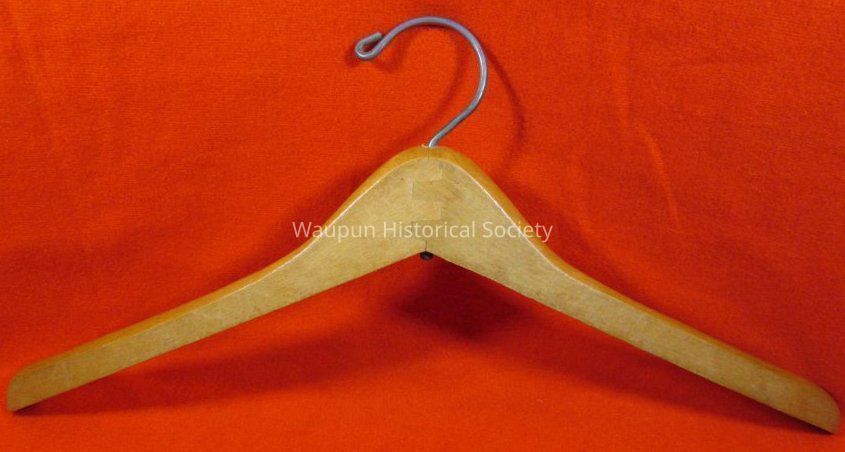 Wooden clothes hanger from THE HUB, Waupun, Wis. The label is black with gold print and a figure of a man with cane and top hat in hand and a pipe- (1 small and 1 large)Acquisition
