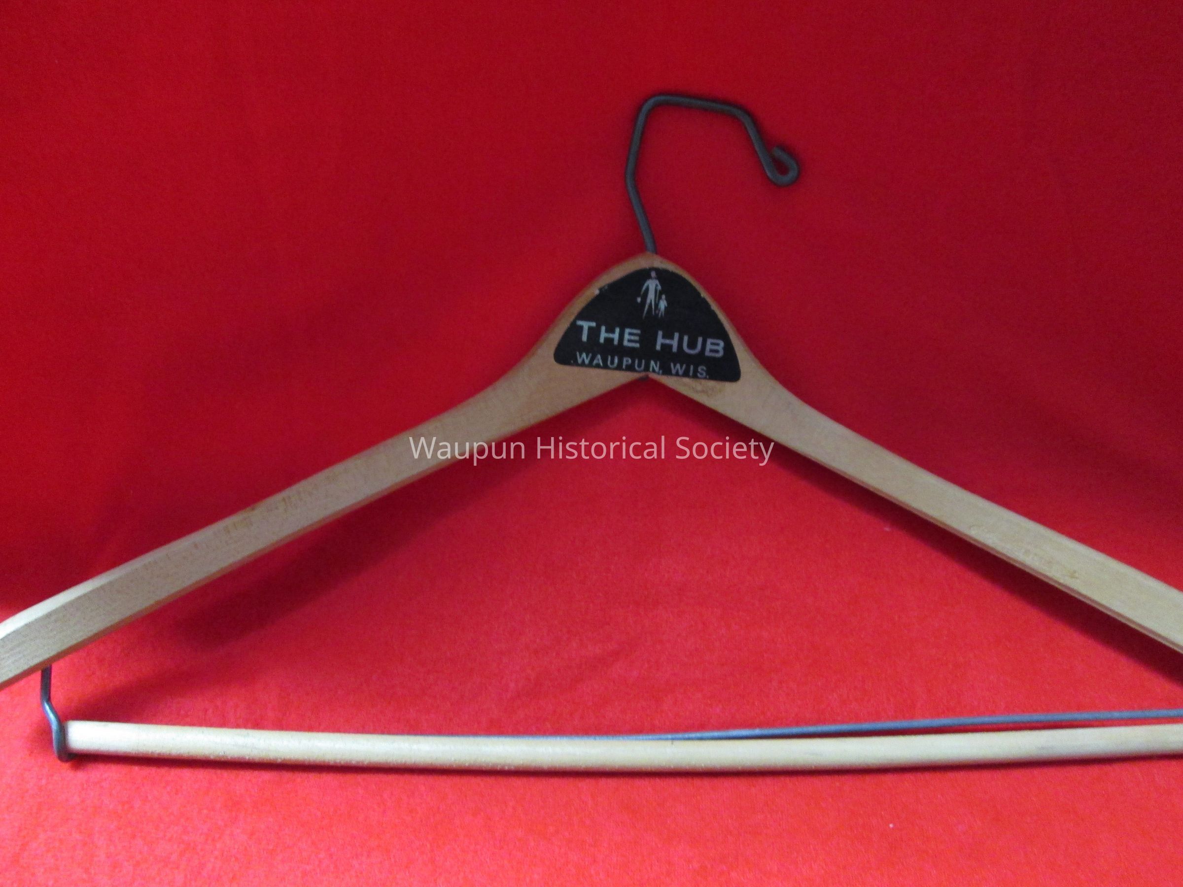 a Hanger for Clothes for men and women17inch long and 4 inch wide made of wood brown in color from the HUB of Waupun Wis.Acquisition