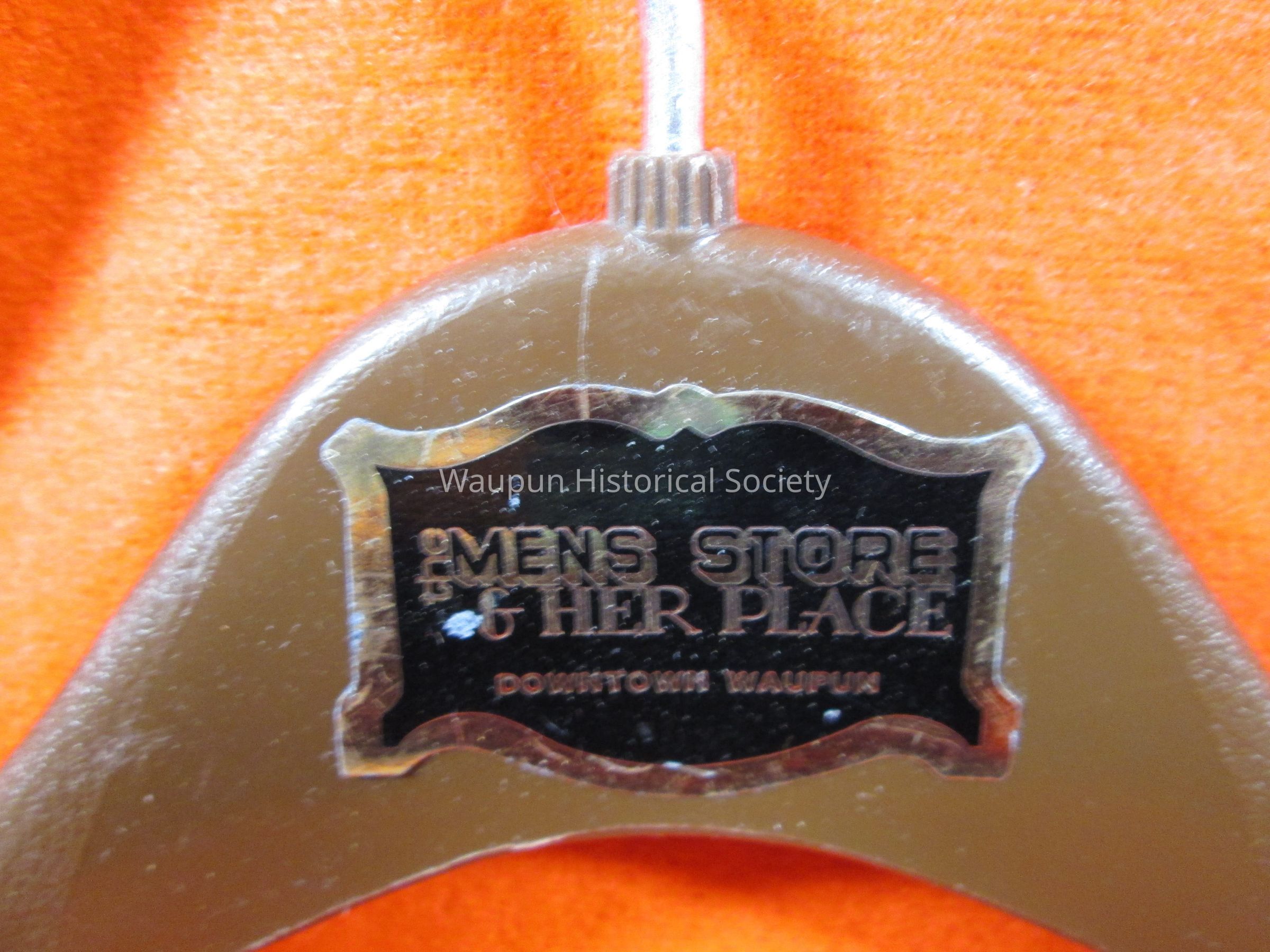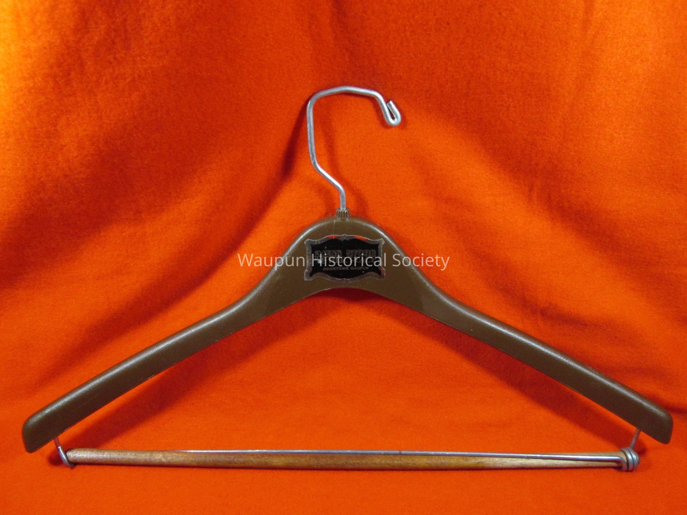 Strong plastic hanger with a wooden rod attached with a metal hook to be used for hanging men's trousers or ladies slacks or skirts. the MENS STORE & HER PLACE Downtown Waupun label on front of hanger.Acquisition