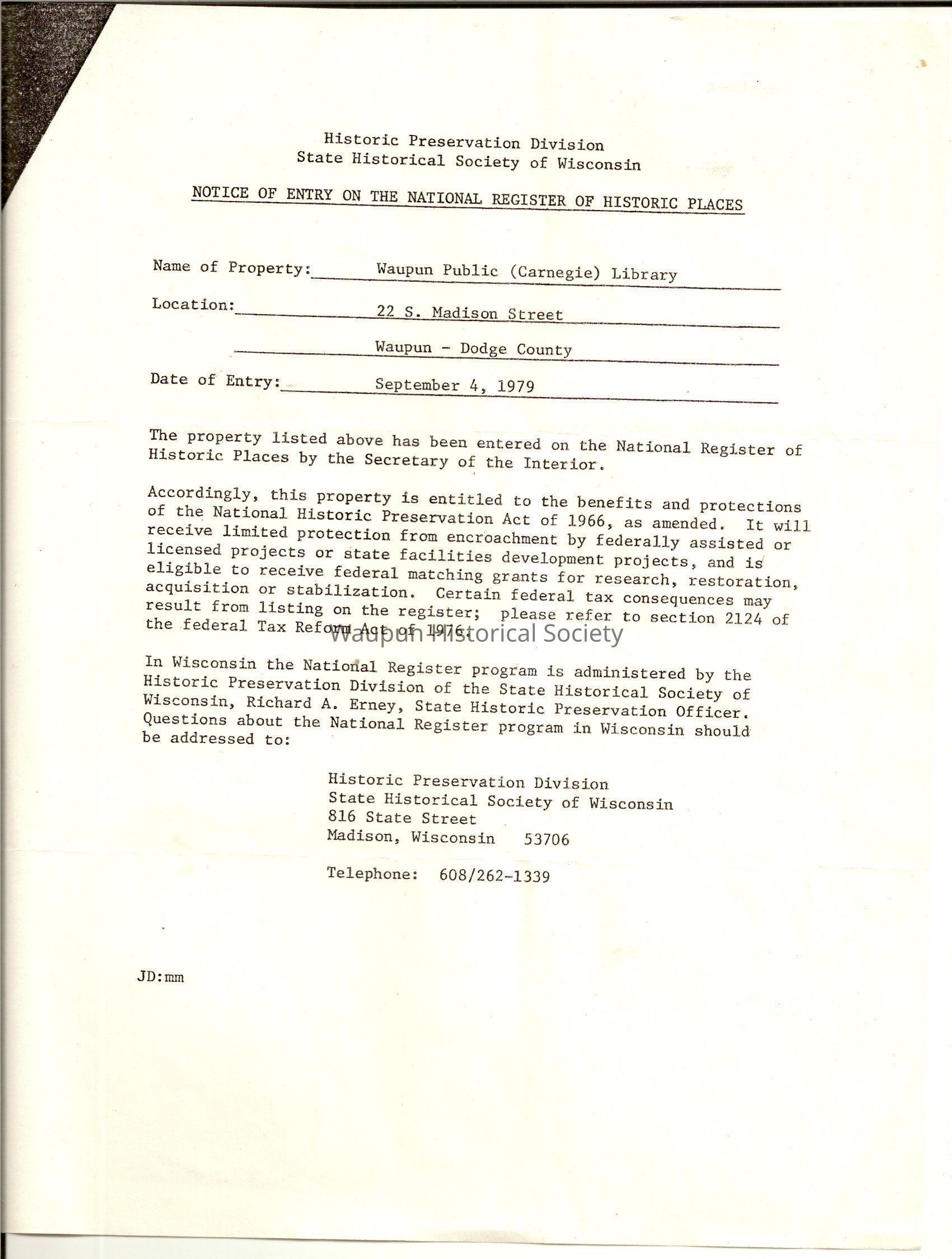 A Document of Waupun Historic Preservation Division your Property indentified on the attached notice form have been considered by wisconsin Historic preservation review board as a possible nominee to the national register of historic Places. The Property listed above has been entered on the national Register of Historic Place by the Secretary of the Interior.Acquisition