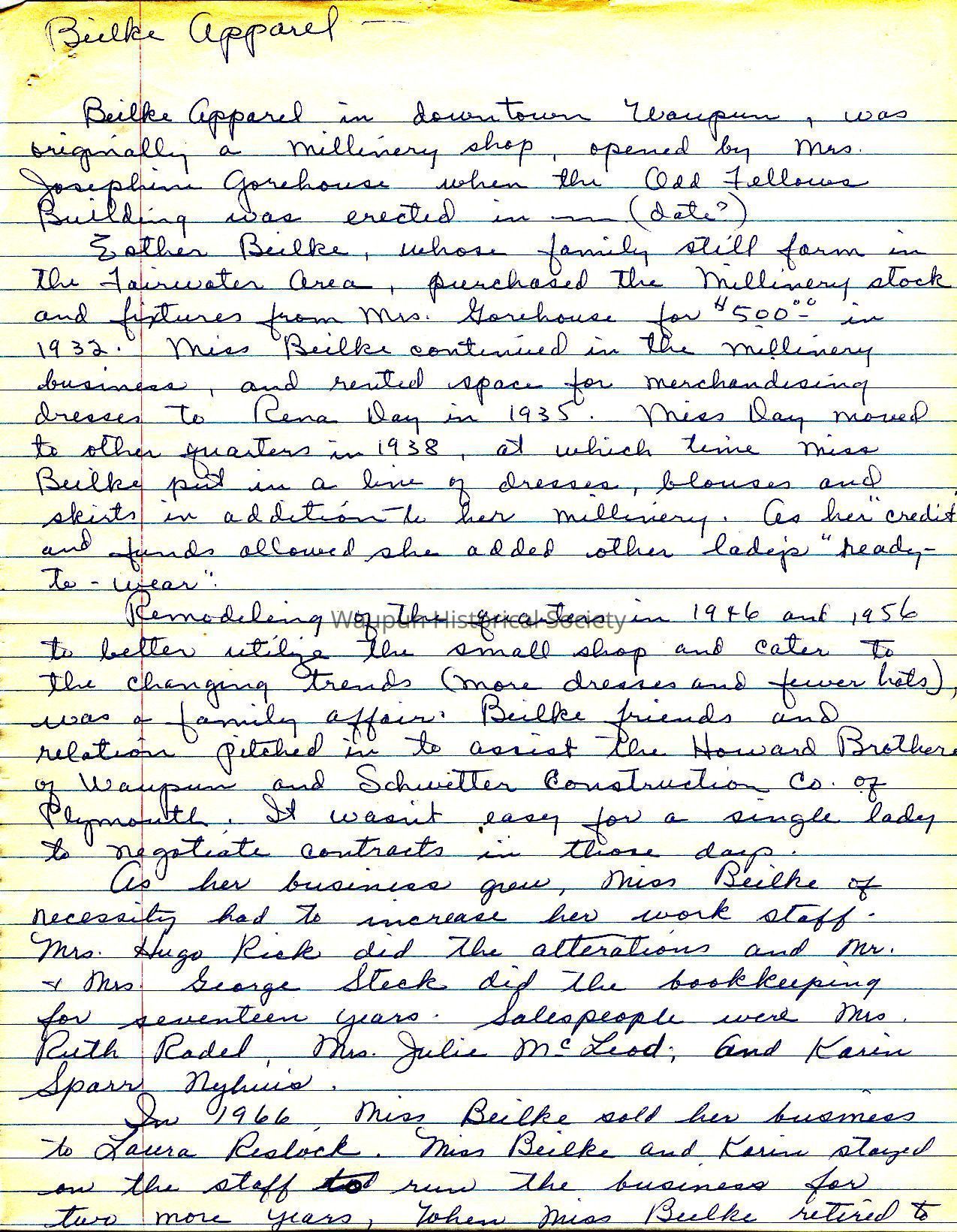 Beilke Apparel in downtown Waupun, was originally a Millinery Shop, opened by Mrs. Josephine Gorehouse when the Odd Fellows Building was erected in. . . . . . . . . .(date ?)
