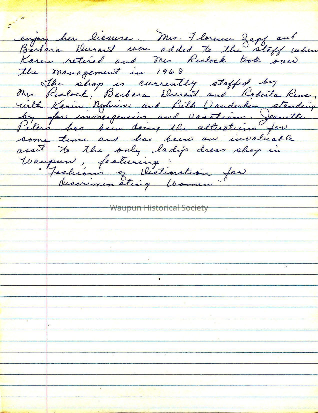 The shop is currently staffed by Mrs. Reslock, Barbara Durant and Roberta Rens, with Karin Nyhuis and Beth Vanderkin standing by for emergencies and vacations. Jeanette Peters has been doing the alterations for some time and has been an invaluable asset to the only lady's dress shop in Waupun, featuring, "Fashions of Destination for Discriminating Women".Acquisition
