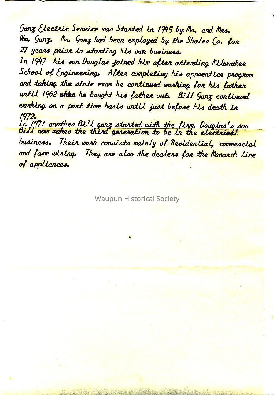 In 1971 another Bill Ganz started with the firm. Douglas's son, Bill, now makes the third generation to be in the electrical business. Their work consists mainly of Residential, commercial and farm wiring. They are also the dealers for the Monarch line of appliances.Acquisition