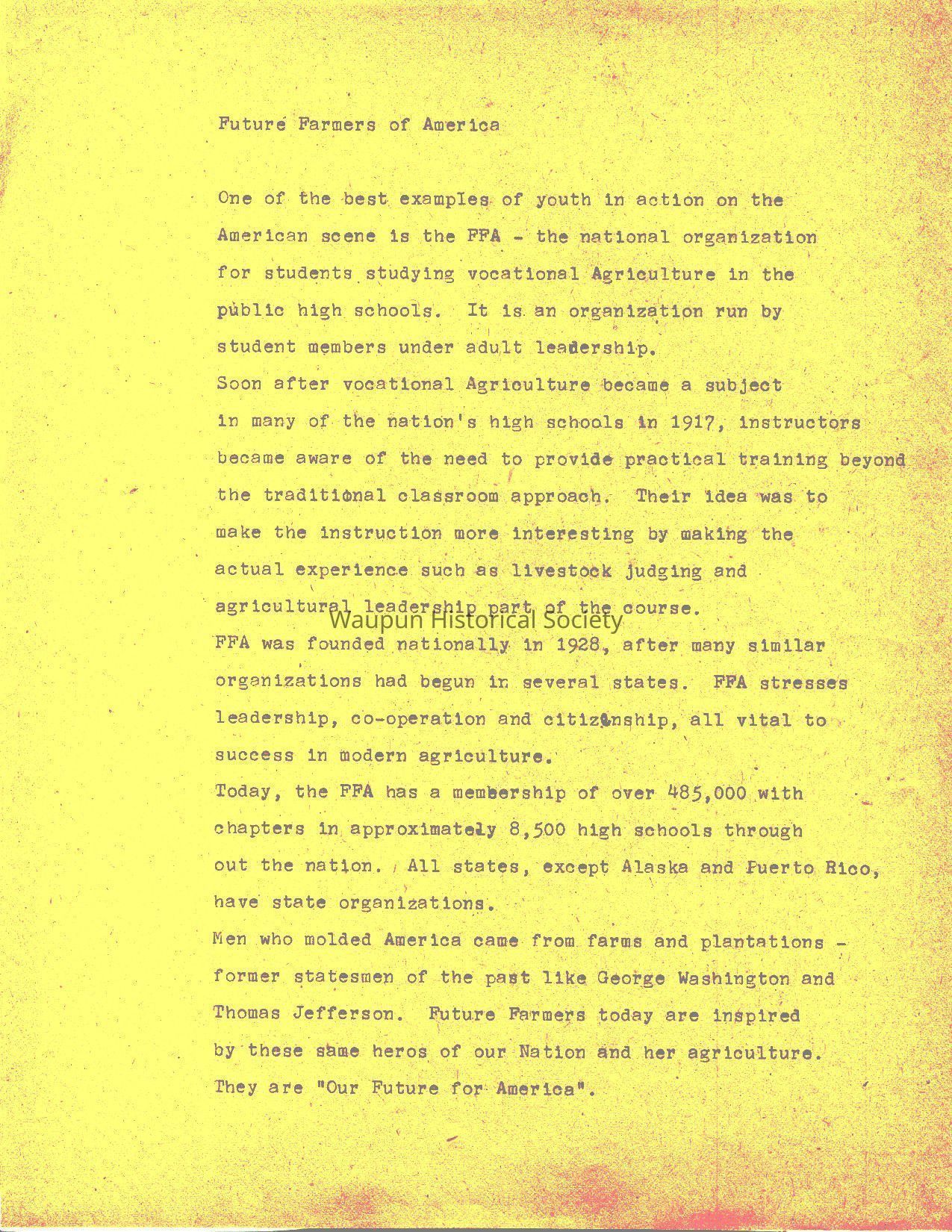 Historical information about FFA, Future Farmers of America for 1976 Bicentennial Celebration in Waupun, WI.