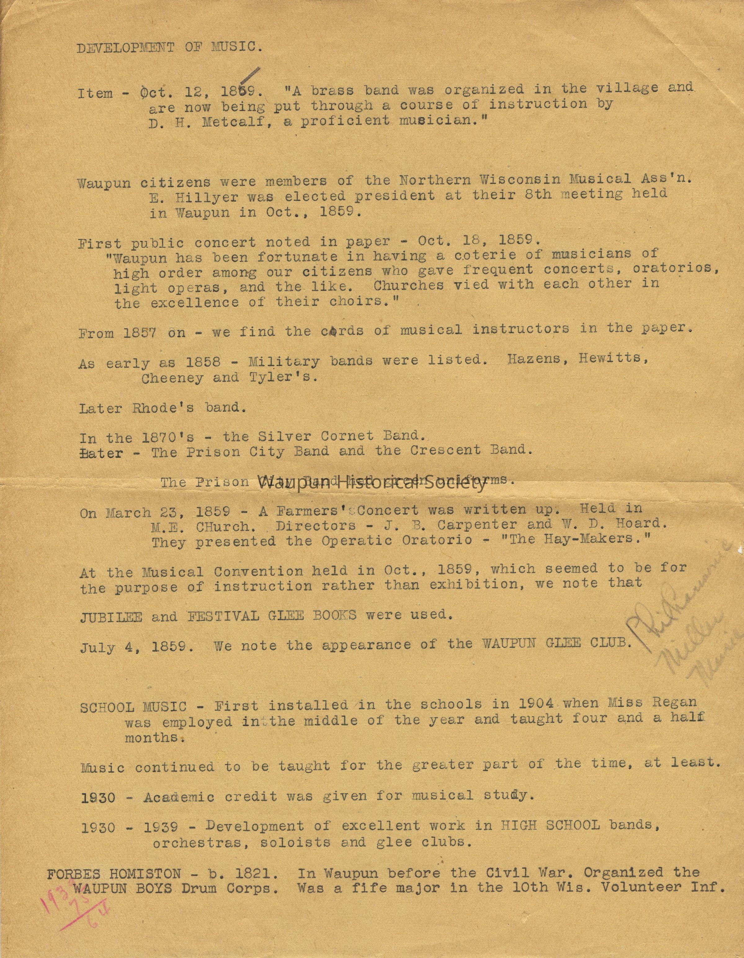 July 4, 1859: We note the appearance of the WAUPUN GLEE CLUB. (Handwritten: Philharmonic Miller Music).