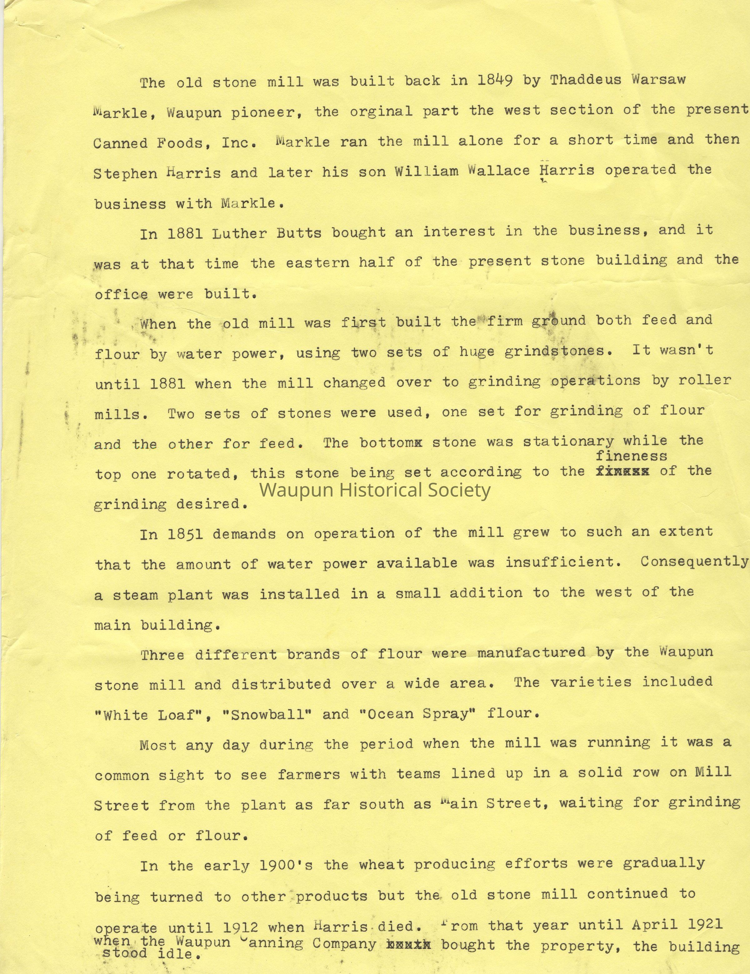 The old stone mill was built back in 1849 by Thaddeus Warsaw Markle, Waupun pioneer, the original part the west section of the present Canned Foods, Inc. Markle ran the mill alone for a short time and then Stephen Harris and later his son, William Wallace Harris operated the business with Markle.