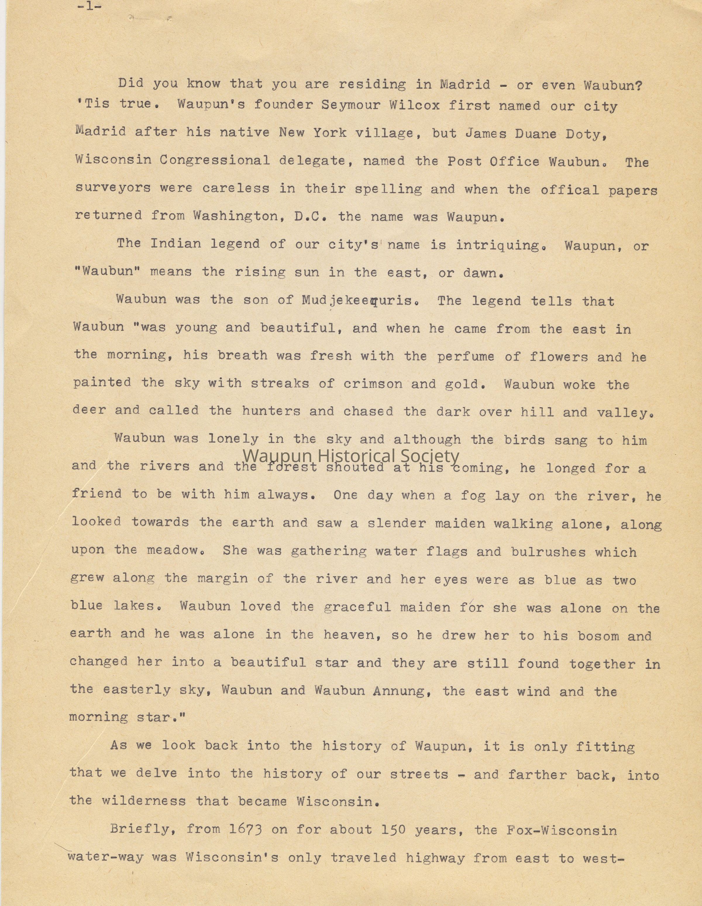 Did you know that you are residing in Madrid--or even Waubun? 'Tis true. Waupun's founder, Seymour Wilcox first named our city Madrid after his native New York village, but James Duane Doty, Wisconsin Congressional delegate, named the Post Office Waubun. The surveyors were careless in their spelling and when the official papers returned from Washington, D. C., the name was "Waupun."