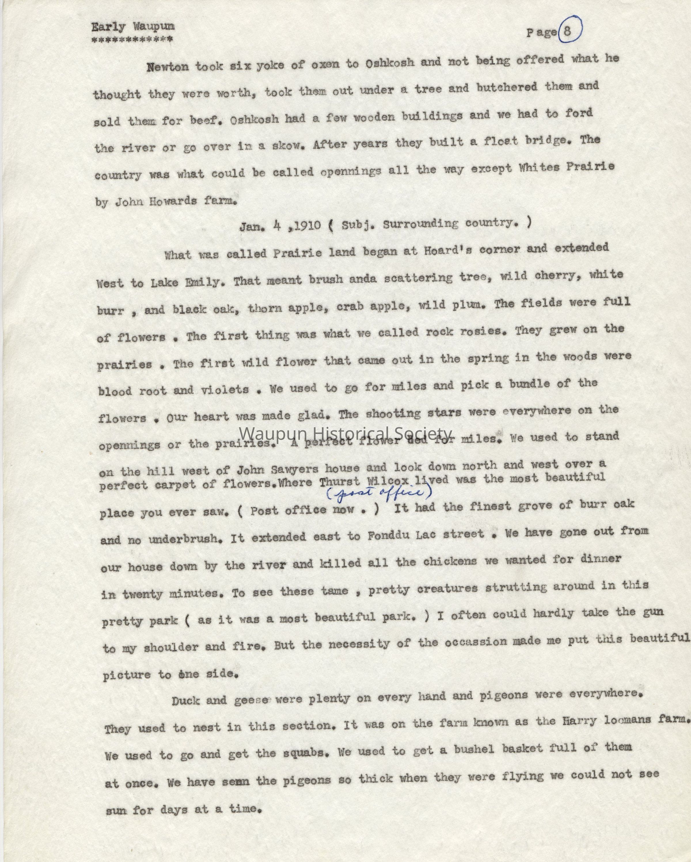 Incidents and Descriptions of Early Waupun. Told by George Newton (Jud) Wilcox, son of Seymour Wilcox (one of the first settlers in Waupun). Upper right corner written in pencil reads "Bertsch." Written by Horatio H. Hoard. Page 8. Typed on onion paper.