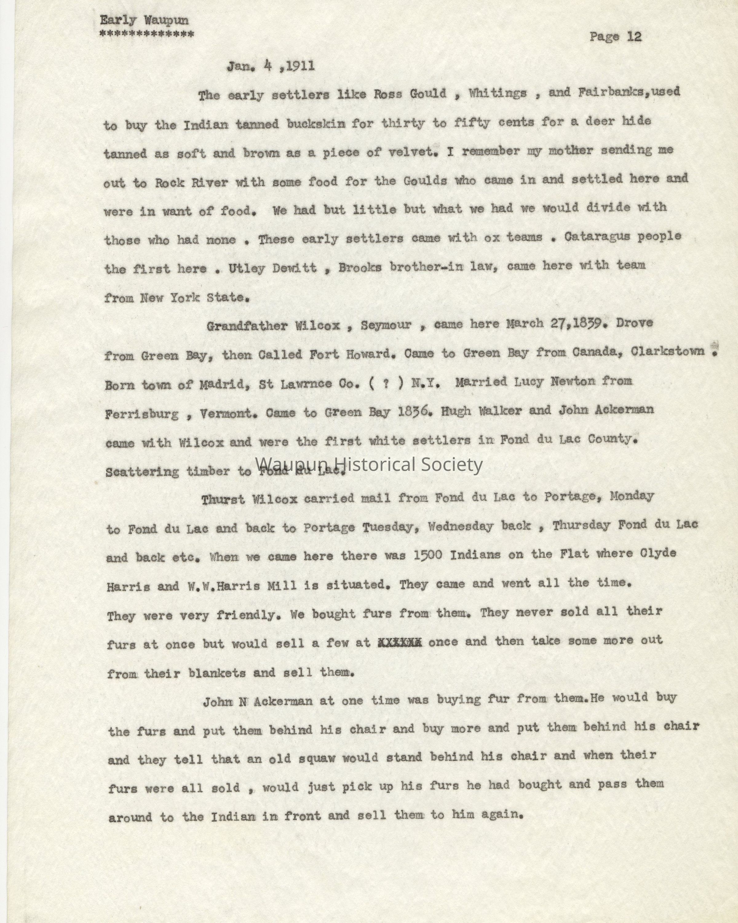 Grandfather Wilcox, Seymour, came here March 27, 1839. Drove from Green Bay, then called Fort Howard. Came to Green Bay from Canada, Clarkstown. Born Town of Madrid, St. Lawrence Co. (?) New York. Married Lucy Newton from Ferrisburg, Vermont. Came to Green Bay 1836. Hugh Walker and John Ackerman came with Wilcox and were the first white settlers in Fond du Lac County. Scattering timber to Fond du Lac.