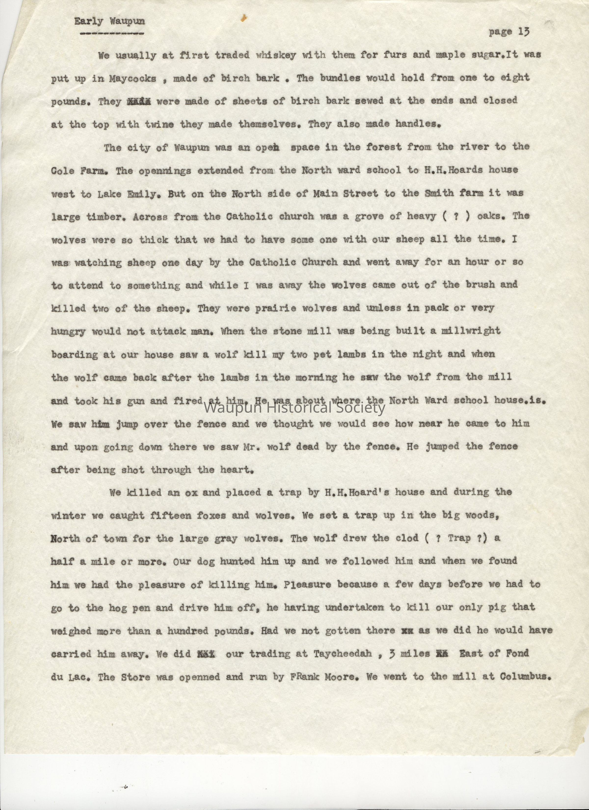 We killed an ox and placed a trap by H. H. Hoard's house and during the winter we caught fifteen foxes and wolves. We set a trap up in the big woods, North of town, for the large gray wolves. The wolf drew the clod (? Trap ?) a half mile or more. Our dog hunted him up and we followed him and when we found him we had the pleasure of killing him. Pleasure because a few days before we had to go to the hog pen and drive him off, he having undertaken to kill our only pig that weighed more than a hundred pounds. Had we not gotten there as we did he would have carried him away. We did our trading at Taycheedah, 3 miles east of Fond du Lac. The store was opened and run by Frank Moore. We went to the mill at Columbus.