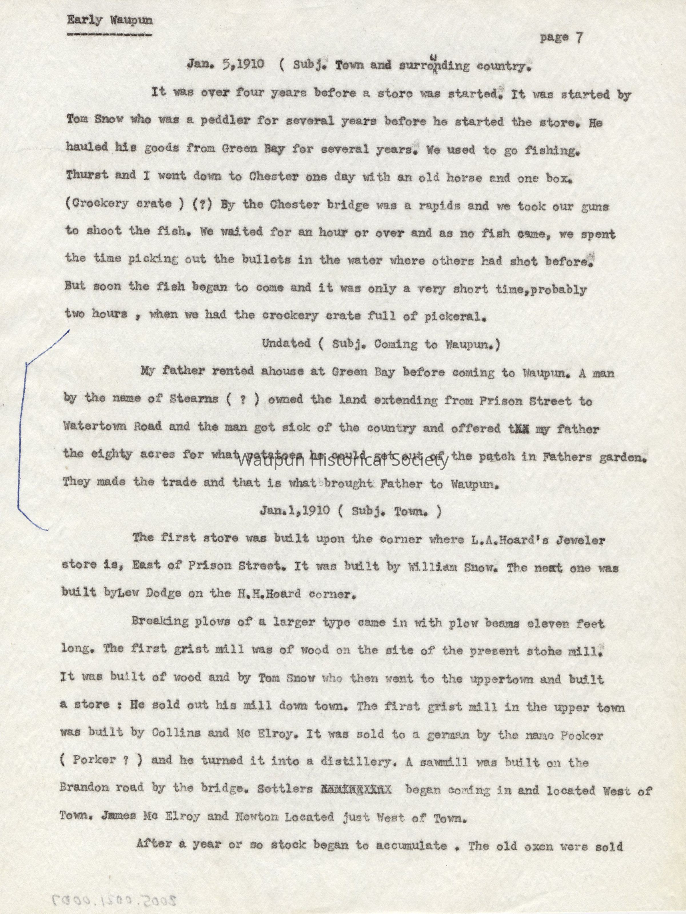 Incidents and Descriptions of Early Waupun. Told by George Newton (Jud) Wilcox, son of Seymour Wilcox (one of the first settlers in Waupun). Upper right corner written in pencil reads "Bertsch." Written by Horatio H. Hoard. Page 7. Typed on onion paper.