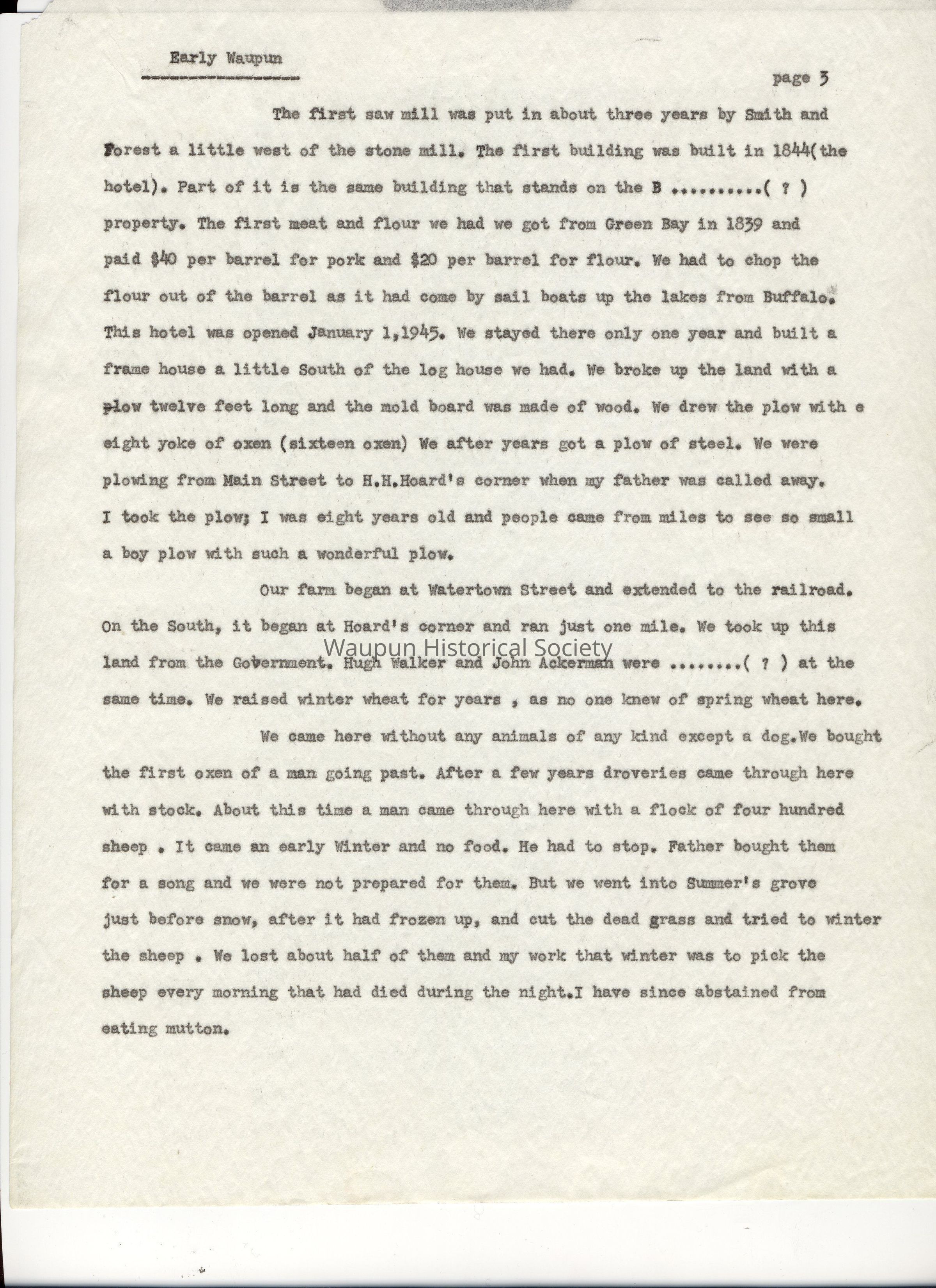 Early Waupun: The first saw mill was put in about three years by Smith and Forest a little west of the stone mill. The first building was built in 1844 (the hotel). Part of it is the same building that stands on the B ...... (?) property. The first meat and flour we had we got from Green Bay in 1839 and paid $40 per barrel of pork and $20 per barrel for flour. We had to chop the flour out of the barrel as it had come by sail boats up the lakes from Buffalo. This hotel was opened January 1, 1845. We stayed there only one year and built a frame house a little south of the log house we had. We broke up the land with a plow twelve feet long and the mold board was made of wood. We drew the plow with eight yoke of oxen (sixteen oxen). We after years got a plow of steel. We were plowing from Main Street to H. H. Hoard's corner when my father was called away. I took the plow; I was eight years old and people came from miles to see so small a boy plow with such a wonderful plow.