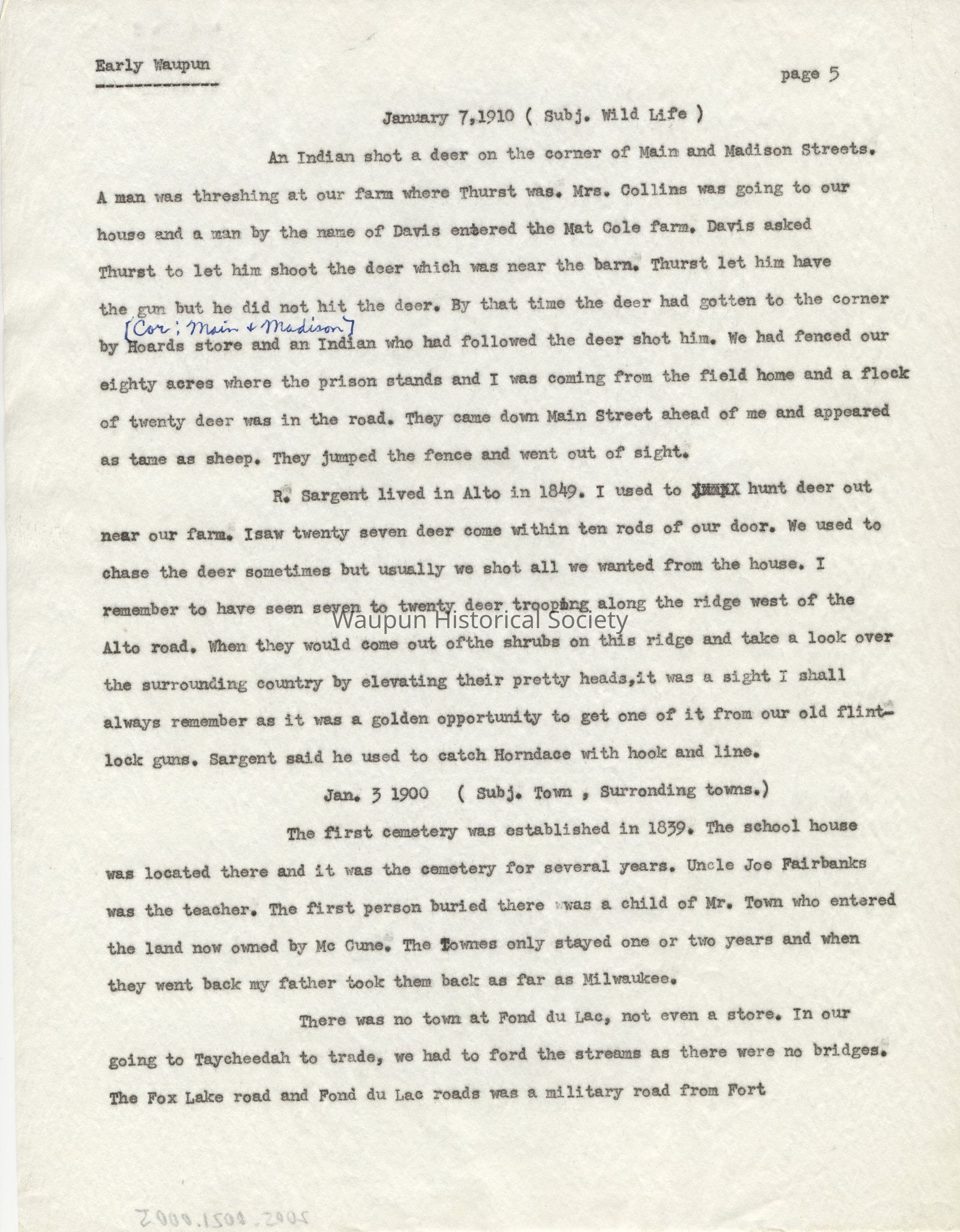 Incidents and Descriptions of Early Waupun. Told by George Newton (Jud) Wilcox, son of Seymour Wilcox (one of the first settlers in Waupun). Upper right corner written in pencil reads "Bertsch." Written by Horatio H. Hoard. Page 5. Typed on onion paper.