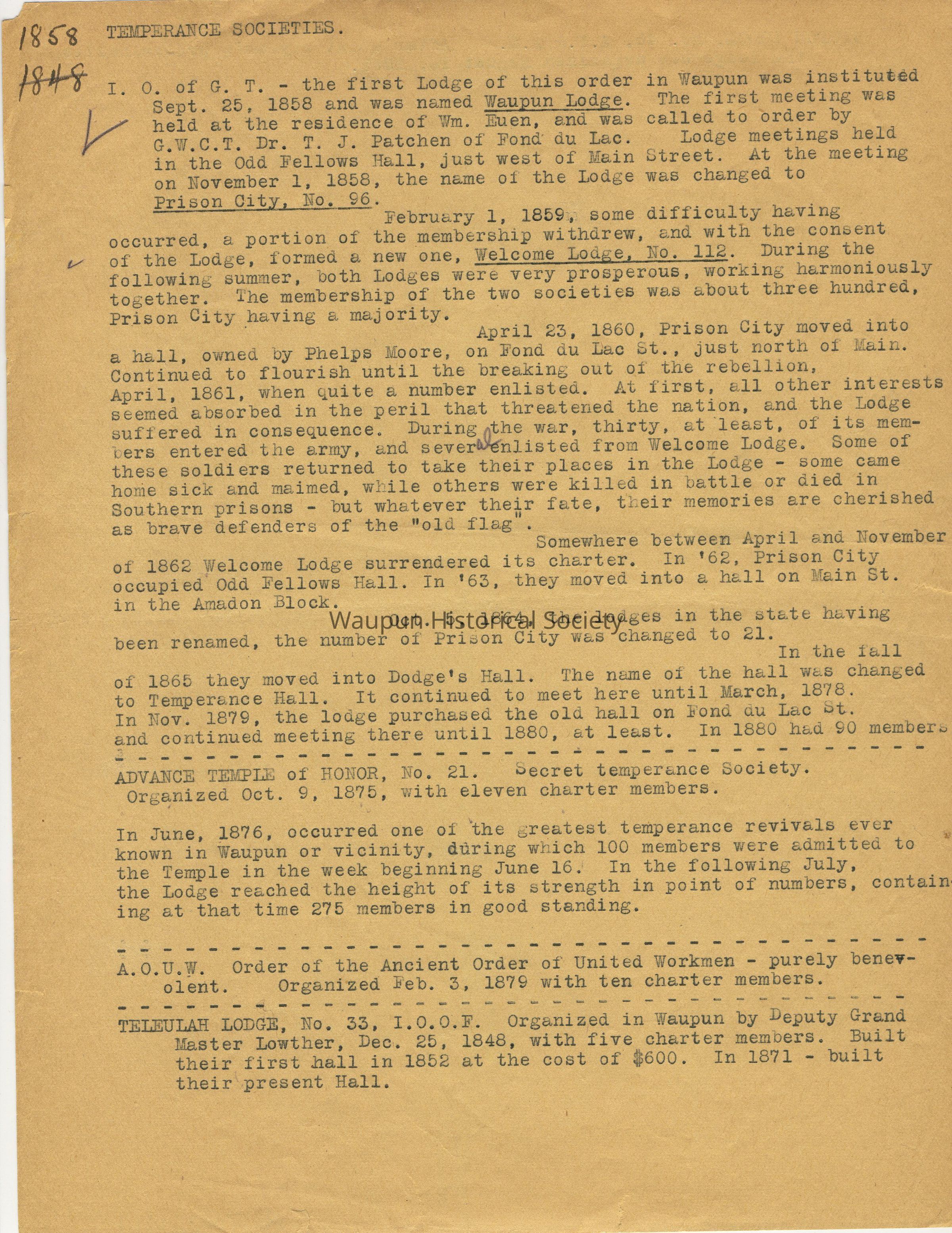 I. O. of G. T. (Good Templars) -- The first Lodge of this order in Waupun was insituted Sept. 25, 1858 and was named "Waupun Lodge." The first meeting was held at the residence of Wm. Euen and was called to order by G.W.C.T. Dr. T. J. Patchen of Fond du Lac. Lodge meetings held in the Odd Fellows Hall, just west of Main Street. At the meeting on November 1, 1858, the name of the lodge was changed to "Prison City, No. 96." February 1, 1859, some difficulty having occurred, a portion of the membership withdrew, and with the consent of the Lodge, formed a new one, "Welcome Lodge, No. 112." During the following summer, both Lodges were very prosperous, working harmoniously together. The membership of the two societies was about three hundred, Prison City having a majority....reference made to Civil War influence on admission and veterans.