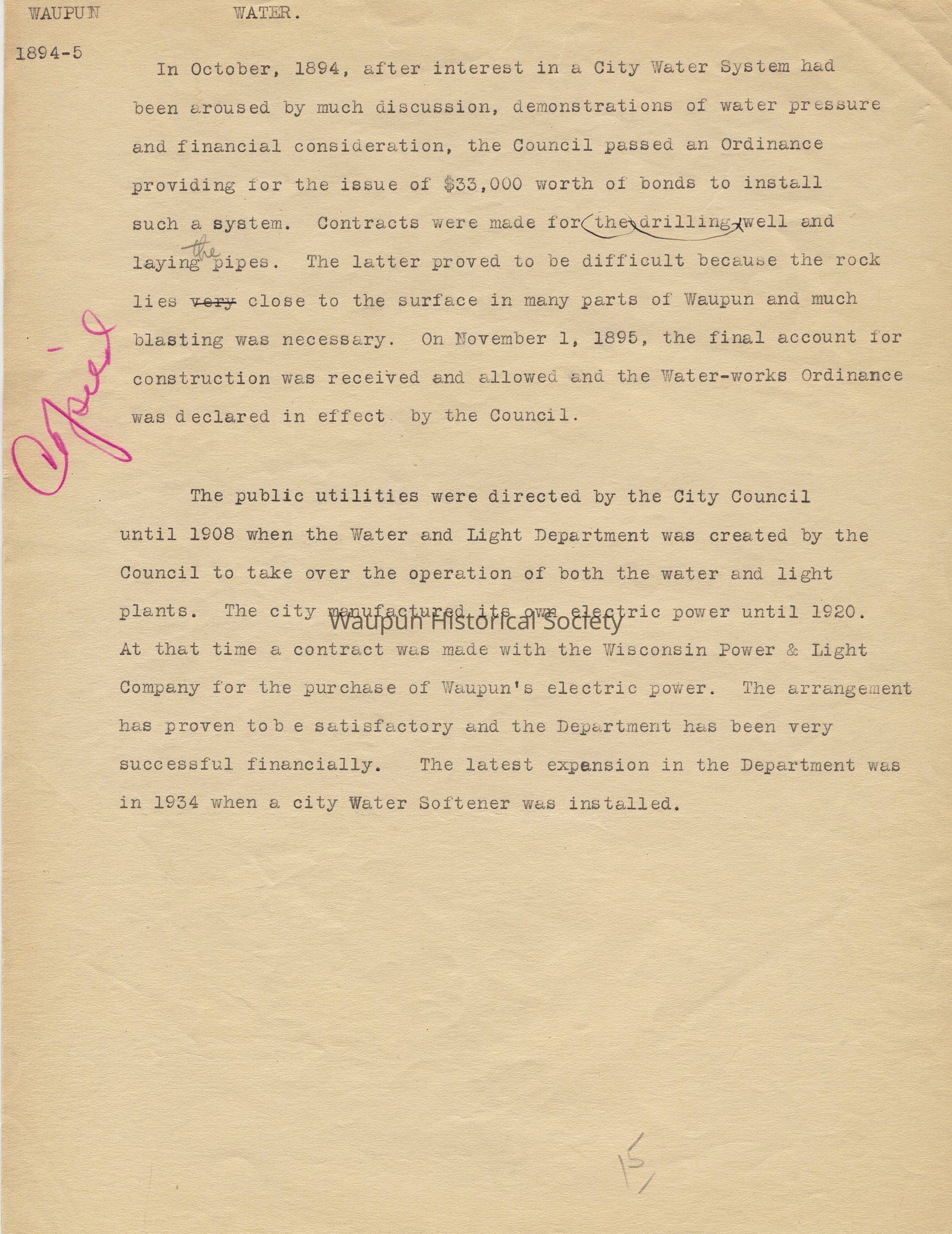 Waupun Water. 1894-5. In October, 1894, after interest in a City Water System had been aroused by much discussion, demontrations of water pressure and financial consideration, the Coucil passed an Ordinance providing for the issue of $33,000 worth of bonds to install such a system. Contracts were made for well drilling and laying the pipes. The later proved to be difficult because the rock lies very close to the surfact in many parts of Waupun and much blasting was necessary. On November 1, 1895, the final account for construction was received and allowed and the Water-works Ordinance was declared in effect by the Council.