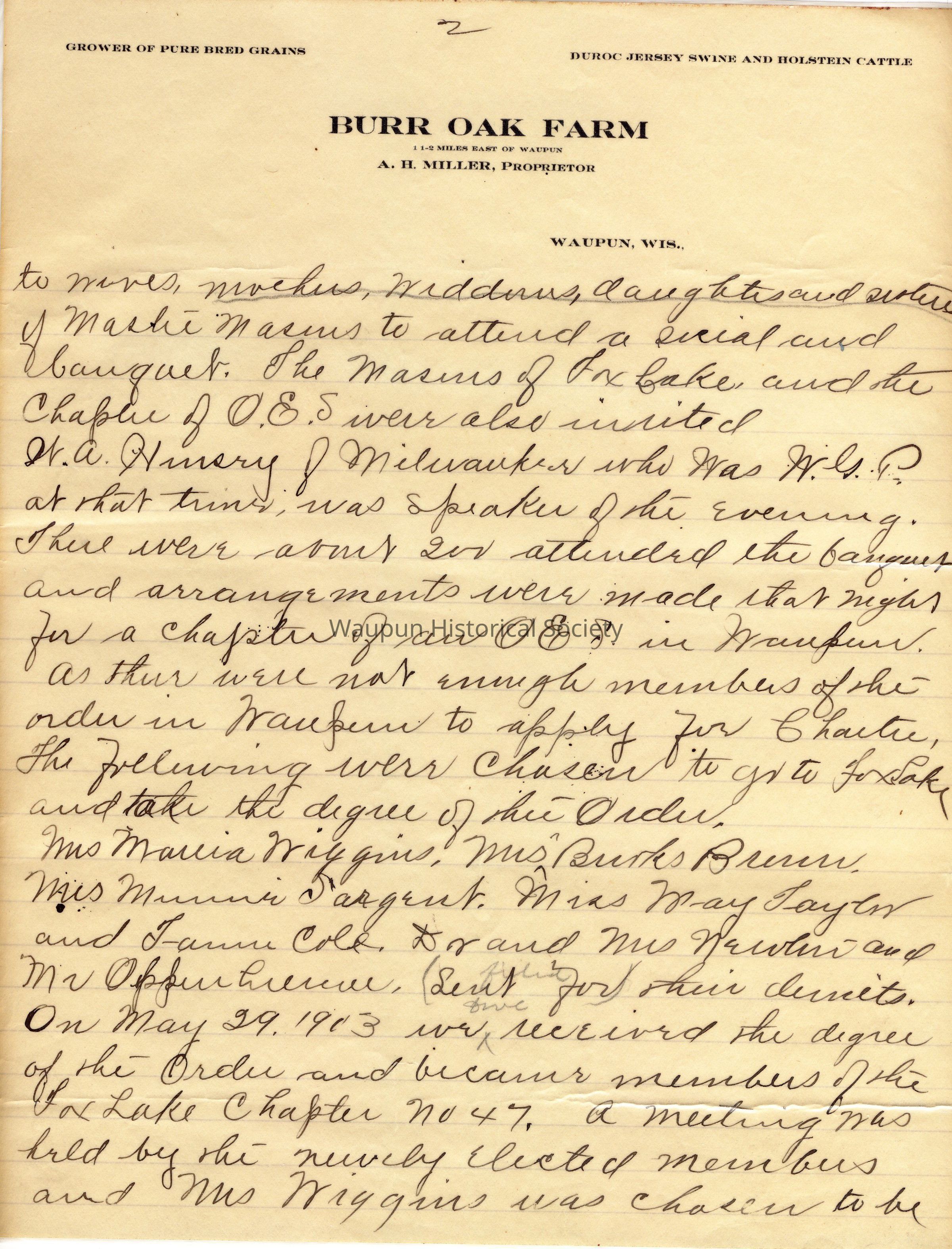 the following were chosen to go to Fox Lake and receive the degrees of the Order. Mrs. Marcia Wiggins, Mrs. Brooks Brown, Mrs. Minnie Sargent, Miss May Taylor and Fannie Colt. Dr. and Mrs. Newton and Mr. Oppenhiemer filed for their demits. On May 29, 1913 we received the degrees of the Order and became members of the Fox Lake Chapter #47.