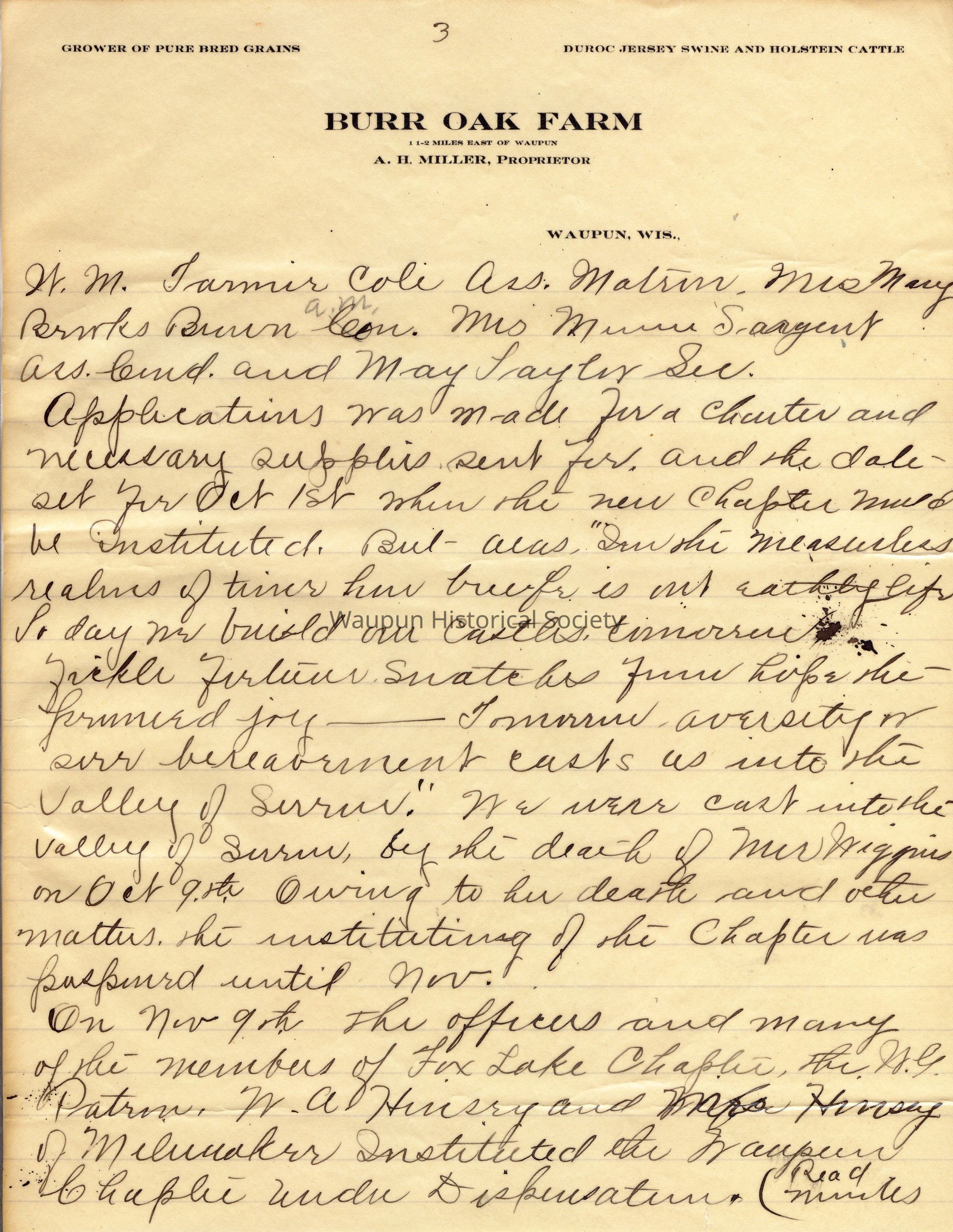 On November 9th the officers and many of the members of Fox Lake Chapter, the Worthy Grand Patron - W. A. Hinsry and Mrs. Hinsry of Milwaukee instituted the Waupun Chapter under Dispensation.