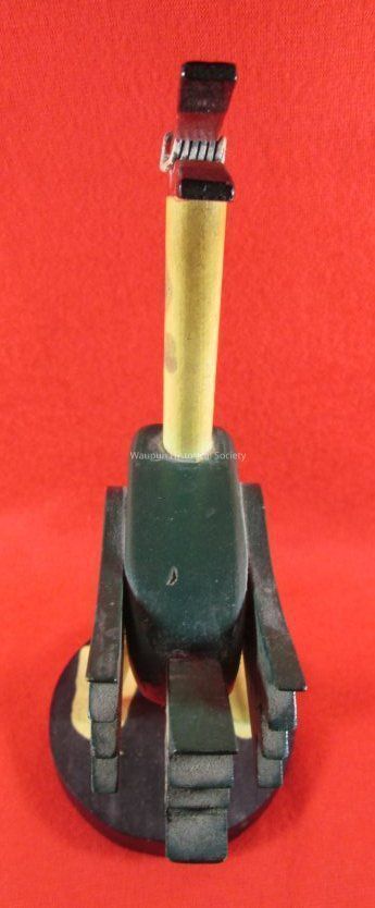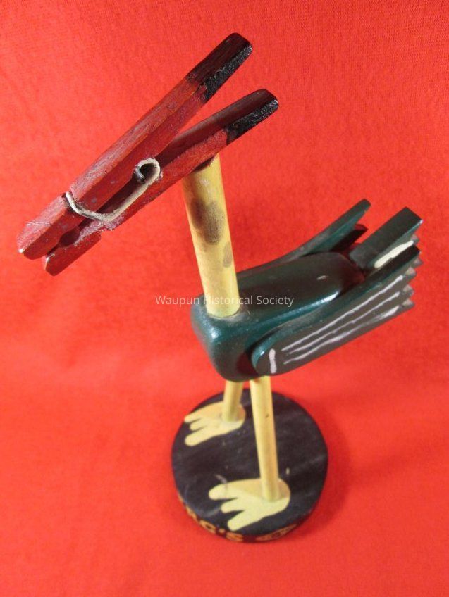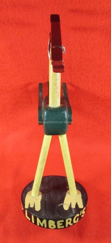 Bird shaped wooden paper holder which has a black circular base, has a green body, yellow legs and neck with a red and black clothes pin head. Limberg's and the D-X logo is painted on the base.Acquisition