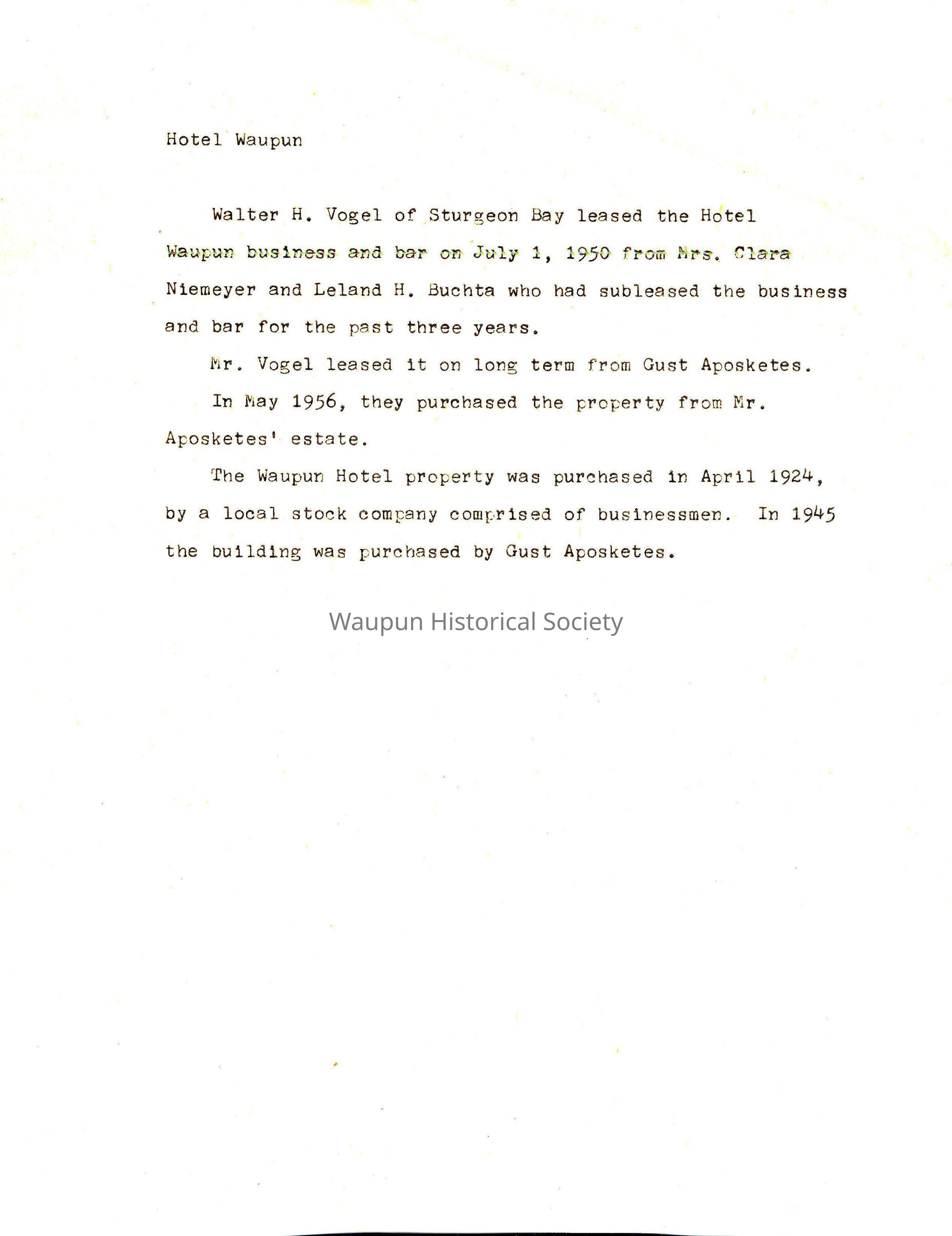 The Waupun Hotel property was purchased in April 1924, by a local stock company comprised of businessmen. In 1945 the building was purchased by Gust Aposketes.Acquisition