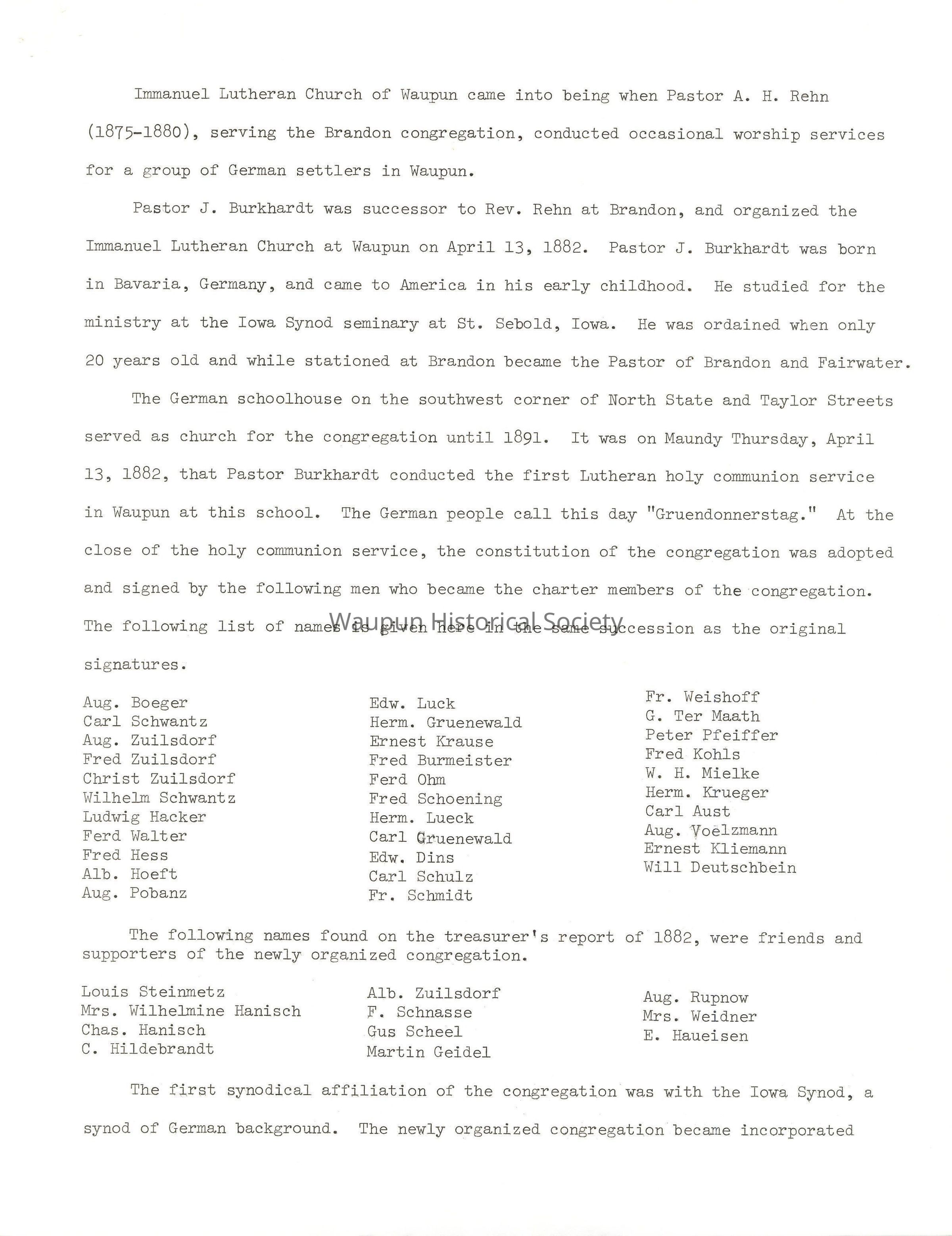 The German schoolhouse on the southwest corner of North State and Taylor Streets served as church for the congregation until 1891. It was on Maundy Thursday, April 13, 1882, that Pastor Burkhardt conducted the first Lutheran holy communion service in Waupun at this school. The German people call this day "Gruendonnerstag." At the close of the holy communion service, the constitution of the congregation was adopted and signed by the following men who became the charter members of the congregation. The following list of names is given here in the same succession as the original signatures.