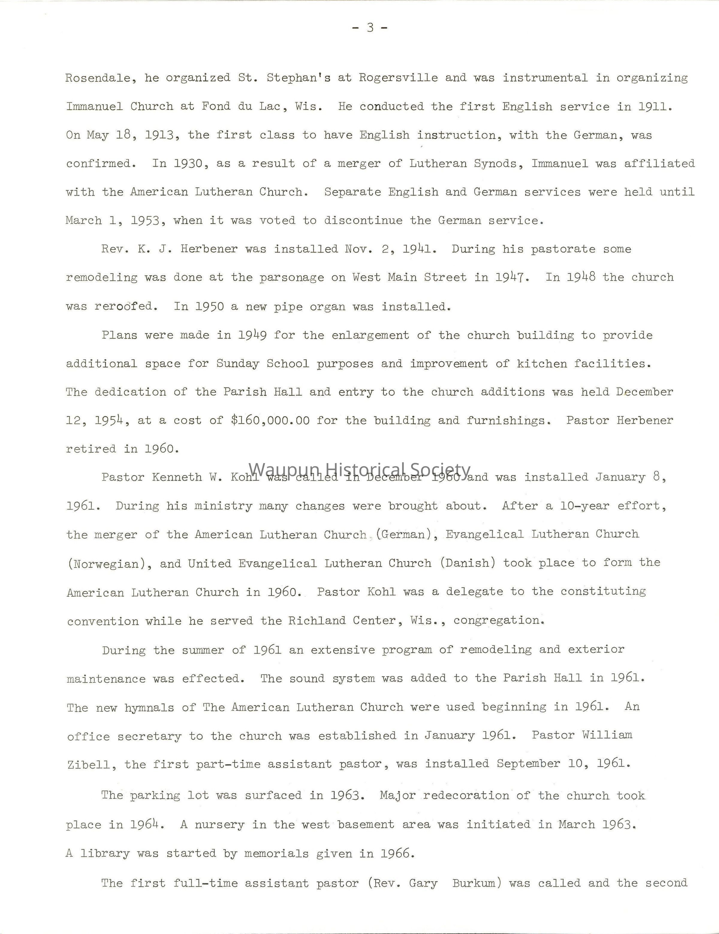 Pastor W. E. Staehling (July 16, 1911-1941) came to America when he was 14 years old, attending confirmation class instruction in the year of his arrival. He trained for the ministry, attending Wartburg College at Waverly, Iowa, and Warburg Seminary, Dubuque, Iowa. He then attended the Lake View English Lutheran Seminary at Chicago before taking charge of his first congregation at Rosendale, Wis. While pastor at Rosendale, he organized St. Stephan's at Rogersville and was instrumental in organizing Immanuel Church at Fond du Lac, Wis. He conducted the first English service in 1911. On May 18, 1913, the first class to have English instruction, with the German, was confirmed. In 1930, as a result of a merger of Lutheran Synods, Immanuel was affiliated with the American Lutheran Church. Separate English and German services were held until March 1, 1953, when it was voted to discontinue the German service.