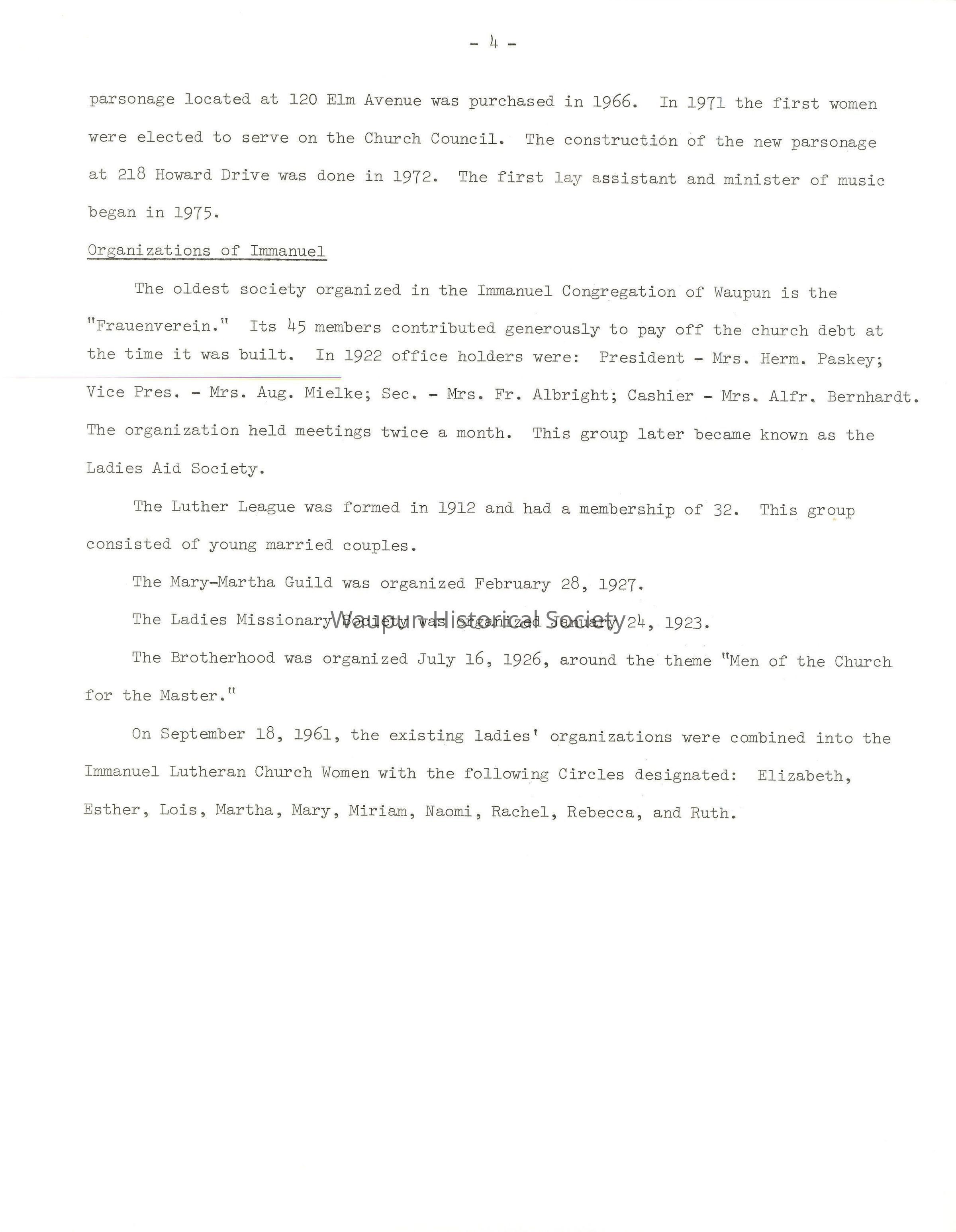 The oldest society organized in the Immanuel Congregation of Waupun is the "Frauenverein." Its 45 members contributed generously to pay off the church debt at the time it was built. In 1922 office holders were: President - Mrs. Herm. Paskey; Vice Pres. - Mrs. Aug. Mielke; Sec. - Mrs. Fr. Albright; Cashier - Mrs. Alfr. Bernhardt. The organization held meetings twice a month. This group later became known as the Ladies Aid Society.