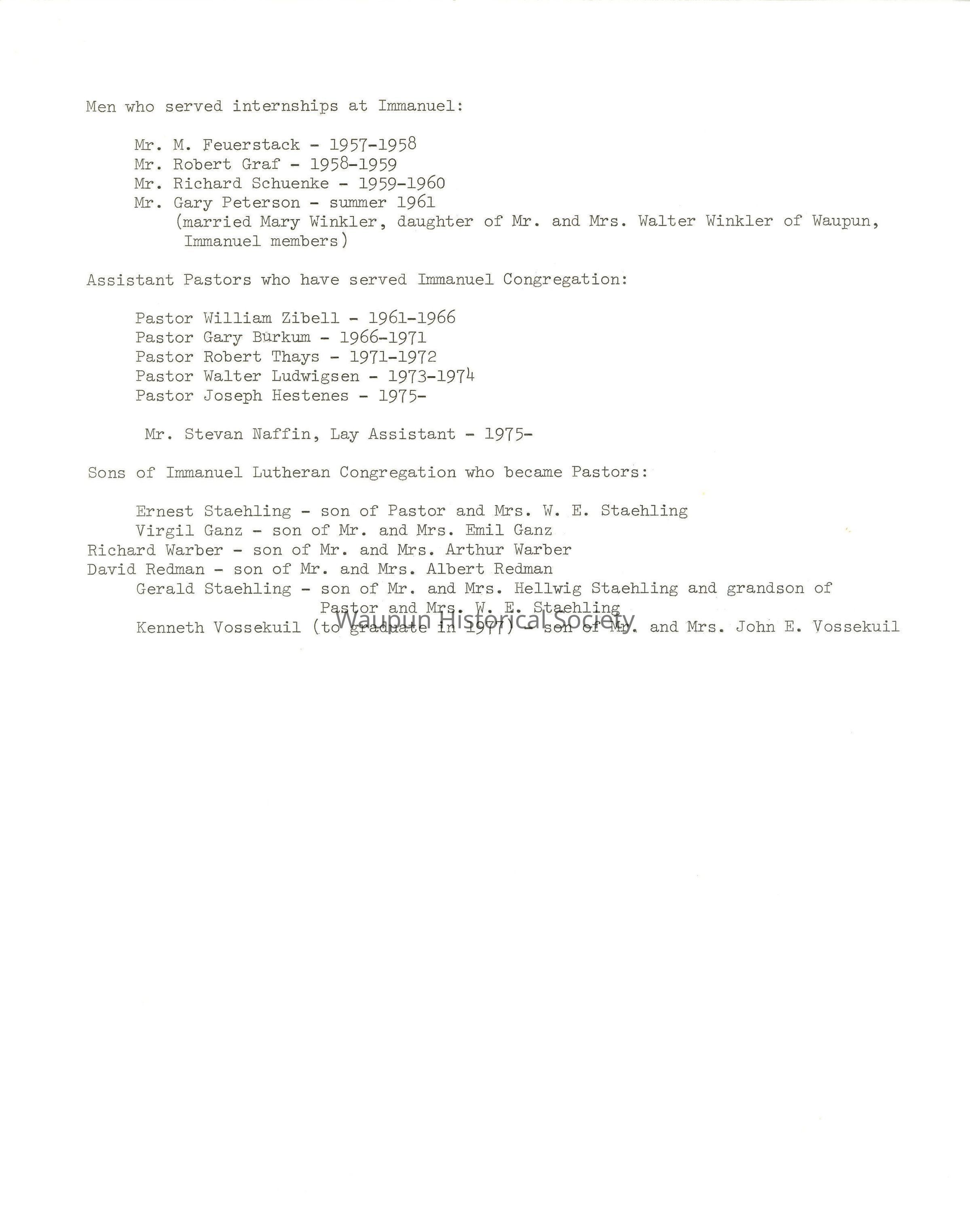 Assistant Pastors who have served Immanuel Congregation: