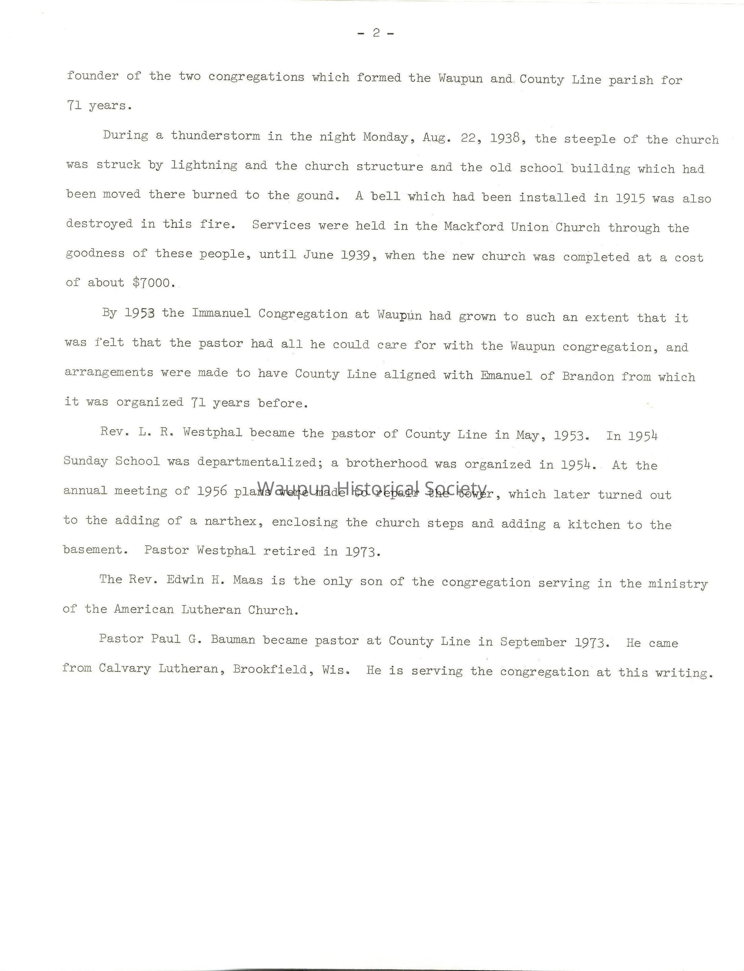 By 1953 the Immanuel Congregation at Waupun had grown to such an extent that it was felt that the pastor had all he could care for with the Waupun congregation, and arrangements were made to have County Line aligned with Emanuel of Brandon from which it was organized 71 years before.