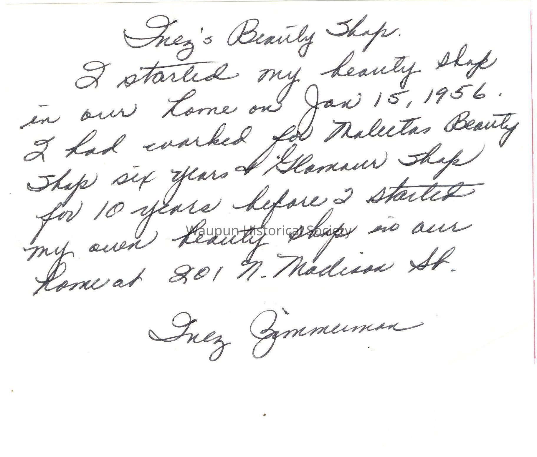 Historical information on Inez's Beauty Shop for 1976 Bicentennial Celebration in Waupun, WI