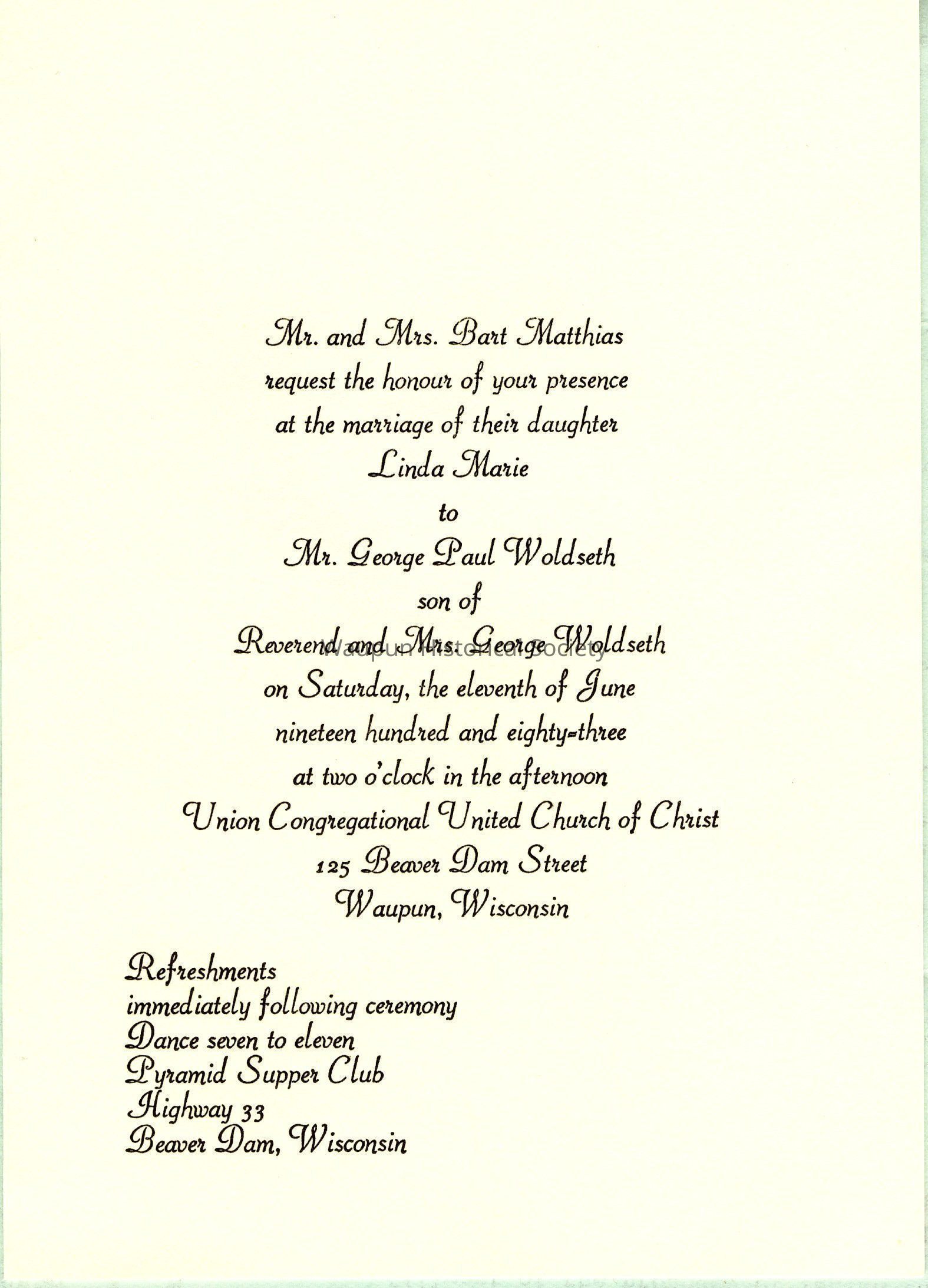 Invitation to Matthias Woldseth wedding, held June 11, 1983.
