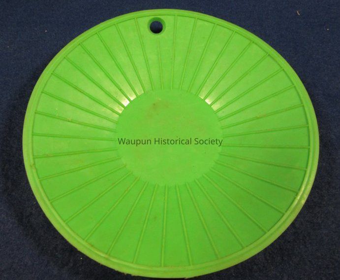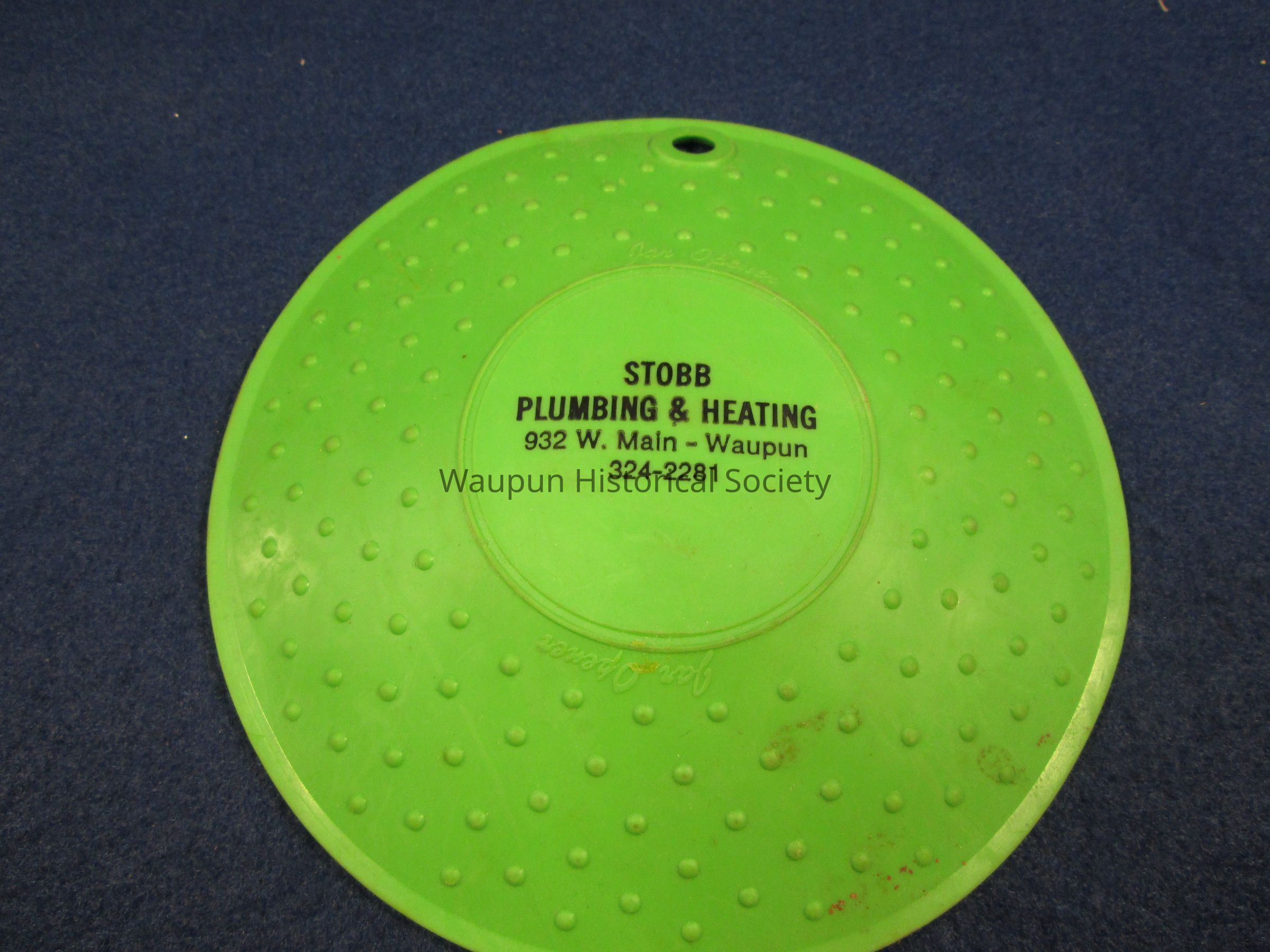 A versitle opener advertising Stobb Plumbing & Heating, 932 W. Main - Waupun, 324-2281. It is round, and green in color with black lettering and made of rubber. Usually used to open glass jars.Acquisition