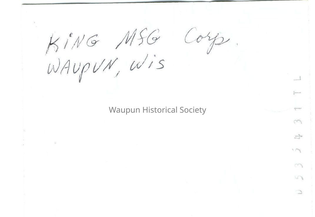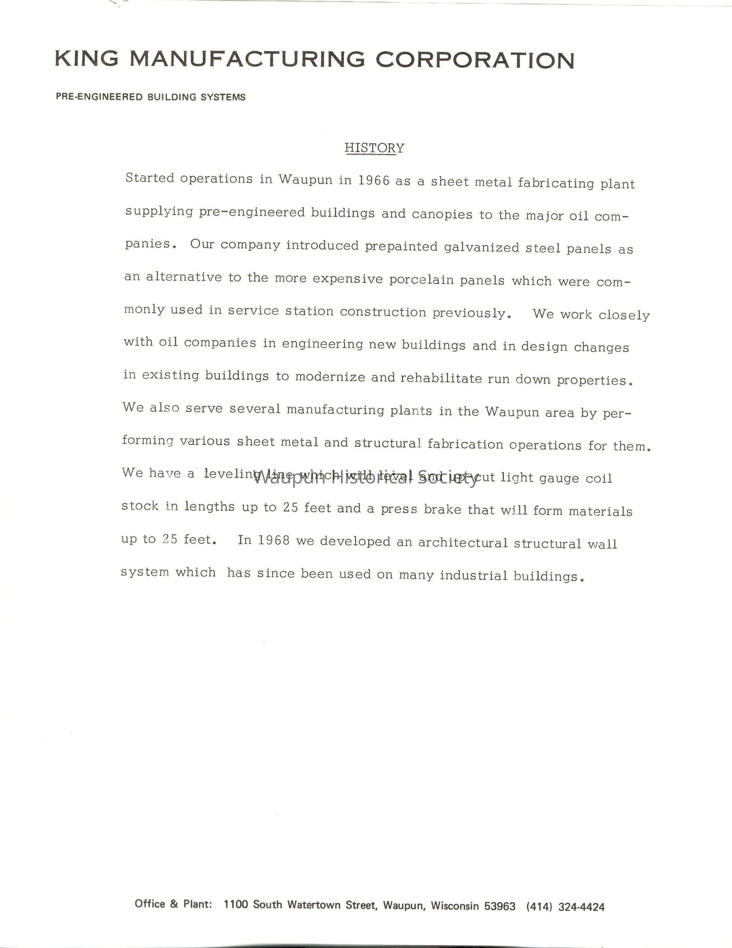Historical information on King Manufacturing Corporation for 1976 Bicentennial Celebration in Waupun, WI