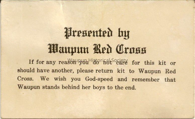 Card that accompanied some sort of kit that was given to the WWI soldier from the Waupun Red Cross. It doesn't indicate exactly what kind of kit was being given, but the soldier might consider not keeping it and pass it on or return it.