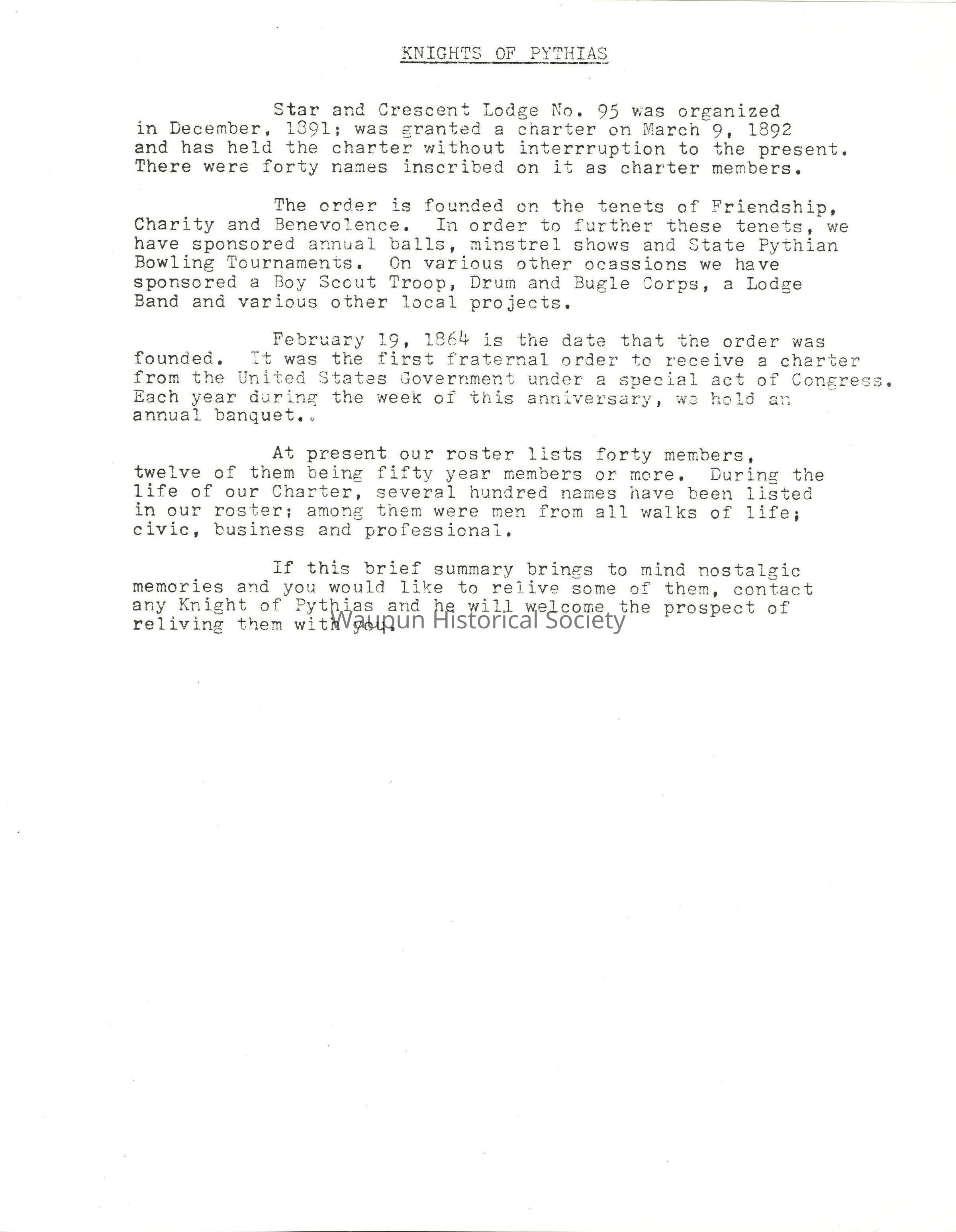 Historical information on Knights of Pythias for 1976 Bicentennial Celebration in Waupun, WI